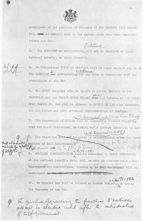 "This Meeting of Representatives of the people of both the South African Republic and the Orange Free State, held at Vereeniging from May 15 to 31, 1902, has with regret taken cognisance of the proposal made by His Majesty's Government relative to the termination of the existing hostilities, and of its communication that this proposal must be accepted or rejected without alteration. It deplores the fact that His Majesty's Government has absolutely refused to negotiate with the Governments of the Republics on the basis of their independence, or to permit their Governments to communicate with their Deputation. Our People have, indeed, always been of opinion that not only on the ground of Right, but also of the great material and personal sacrifices made for their independence, they had a well-founded claim to that Independence.