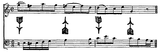 Another retardment, arising from a different cause, frequently takes place in the trumpet-parts; it is when they contain a quick flow of passages such as this:—