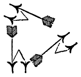 In the time, three in a bar, the first gesture made, from up to down, is likewise universally adopted for marking the first beat; but there are two ways of marking the second. The majority of orchestral conductors indicate it by a gesture from left to right; thus:—