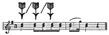 The arm and the stick of the conductor are raised, so that his hand is on a level with his head, he marks the first beat, by dropping the point of his stick perpendicularly (bending his wrist as much as possible; and not lowering the whole arm), and the second beat by raising the stick by a contrary gesture.