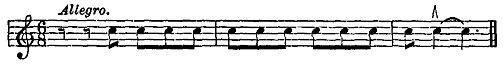 Taking the three measures shown above in order, the conductor must beat three quavers down, and three up, for the time of 6⁄8:—
