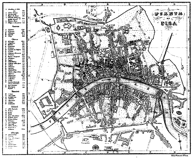 Pise est divisée par le fleuve Arno en deux parties qui communiquent par le moyen de trois ponts: le Ponte di Mezzo, le Pont aux Plages, ou alla Fortezza, et le Pont Solferino, appelé aussi Pont Neuf. Il y a encore, hors de la Porta a Mare, deux autres ponts: le pont de circonvallation, utile au commerce pour transporter les marchandises sans rentrer en ville; et le pont de fer sur lequel passent les trains du chemin de fer. Les quais de l'Arno forment la promenade la plus belle et la plus animée de la ville et offrent un coup d'oeil enchanteur. Ils portent les noms de Lungarno Galileo, Gambacorti, Regio et Mediceo. On compte à Pise quatre théâtres: deux diurnes placés hors des portes et deux nocturnes en ville, savoir: Teatro Nuovo, rue Palestro (pl. 52, C. 1); R. Teatro E. Rossi, place S. Niccola (pl. 53, C. 4); Politeama, hors de Porta a Piagge (pl. 54, D 23); Arena Federighi ou Garibaldi, hors la Porta a Lucca (pl. 55, A 6).
