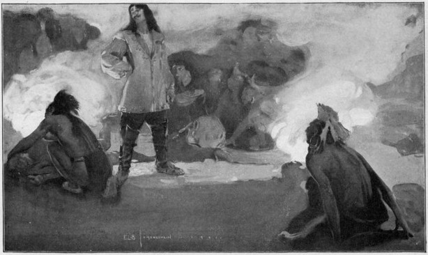 Another sun was setting. A single drum was beating loudly as the little garrison drew up outside the sally-port and presented arms. The allies and the mission Indians were crowding down upon the beach, silent, inquisitive,––puffing at their short pipes. For half a league, from the flat, white beach out over the rose-tinted water stretched an irregular black line of canoes and bateaux, all bristling with muskets. The Governor had come. He could be seen kneeling, all sunburned and ragged but with erect head, in the first canoe. His canoemen checked their swing, for the beach was close at hand, and then backed water. The bow scraped, and a dozen hands were outstretched in aid, but Governor Denonville stepped briskly out into the ankle-deep water and carried his own pack ashore. A cheer went up from the little line at the sally-port. Du Luth’s voyageurs and coureur de bois caught it up, and then it swept far out over the water and was echoed back from the forest.