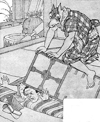 The badger, finding his legs pain him, began to cry, and begged the old woman to untie him, promising to help her pound the millet. The tired old dame, believing the sly beast, like a good-hearted soul laid down her pestle and loosened the cords round the beast's legs. The badger was so cramped at first that he could not stand; but when well able to move, he seized a knife to kill the old woman. The hare, seeing this, ran away to find the old man, if possible, and tell him. The badger, after stabbing the old woman, crushed her to death by upsetting the bureau upon her, and then threw her body into the mortar, and pounded her into a jelly. Setting the pot on to boil, he made the woman's flesh into a mess of soup, and ate all he could of it. Then the badger, by turning three double somersaults, turned himself into an old woman, looking exactly like the one he had just eaten. All being ready, he waited till the husband came home tired and hungry.