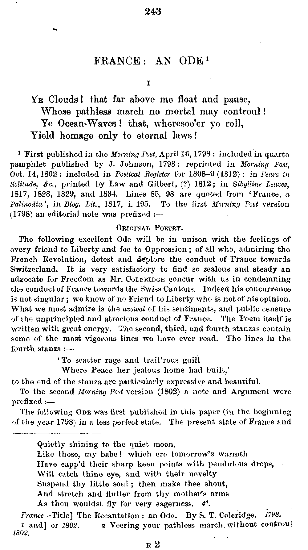 page 256: Title] Fears &c. Written, April 1798, during the Alarms of
