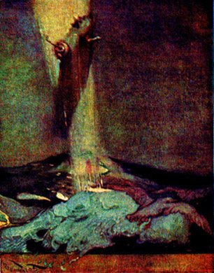 The turbines whistle reflectively. From the low-arched expansion-tanks on either side the valves descend pillarwise to the turbine-chests, and thence the obedient gas whirls through the spirals of blades with a force that would whip the teeth out of a power-saw. Behind, is its own pressure held in leash or spurred on by the lift-shunts; before it, the vacuum where Fleury's Ray dances in violet-green bands and whirled turbillions of flame. The jointed U-tubes of the vacuum-chamber are pressure-tempered colloid (no glass would endure the strain for an instant) and a junior engineer with tinted spectacles watches the Ray intently. It is the very heart of the[20] machine—a mystery to this day. Even Fleury who begat it and, unlike Magniac, died a multi-millionaire, could not explain how the restless little imp shuddering in the U-tube can, in the fractional fraction of a second, strike the furious blast of gas into a chill grayish-green liquid that drains (you can hear it trickle) from the far end of the vacuum through the eduction-pipes and the mains back to the bilges. Here it returns to its gaseous, one had almost written sagacious, state and climbs to work afresh. Bilge-tank, upper tank, dorsal-tank, expansion-chamber, vacuum, main-return (as a liquid), and bilge-tank once more is the ordained cycle. Fleury's Ray sees to that; and the engineer with the tinted spectacles sees to Fleury's Ray. If a speck of oil, if even the natural grease of the human finger touch the hooded terminals Fleury's Ray will wink and disappear and[21] must be laboriously built up again. This means half a day's work for all hands and an expense of one hundred and seventy-odd pounds to the G. P. O. for radium-salts and such trifles.