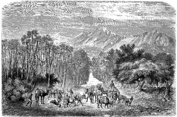 «Le 10, nous entrons dans une forêt, dont les arbres en fleurs remplissent l'air de parfums; deux étangs nous y fournissent une eau excellente, qui, en 1854, faillit causer la mort de tous les gens de mon escorte. C'est un endroit insalubre; nous y restons vingt-quatre heures, parce que l'un de nos chameaux s'est égaré; et le fait paraît si extraordinaire que dans le voisinage on disait, en parlant de moi: «Celui qui a passé tout un jour dans le désert pernicieux.»
