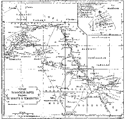 (p. 235)Kabara. — Visites importunes. — Dangereux passage. — Tinboctoue, Tomboctou ou Tembouctou. — El Bakay. — Menaces. — Le camp du cheik. — Irritation croissante. — Sus au chrétien! — Les Foullanes veulent assiéger la ville. — Départ. — Un preux chez les Touaregs. — Zone rocheuse. — Lenteurs désespérantes. — Gogo. — Gando. — Kano. — Retour.