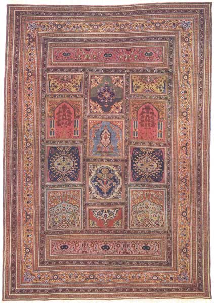 This interesting and valuable rug is of antique Tabriz weave, of finely blended colors, and rare design. It represents the individual squares on the floor of a mosque, each one of which may be occupied by a worshipper kneeling in prayer. Rugs with a single design of this kind are usual, but a grouping of many such spaces in one rug is rare. Forms of the Tree of Life are represented in different panels, and the border is very rich and handsome. The fabric is fine, the texture soft and firm. The rich and splendid hues of the various panels are so soft in tone that, while there are several different colors in juxtaposition, these have been arranged so deftly and artistically that the effect is perfectly harmonious. It is impossible to describe in words the mellow richness and rare art displayed in this unique product of the loom.