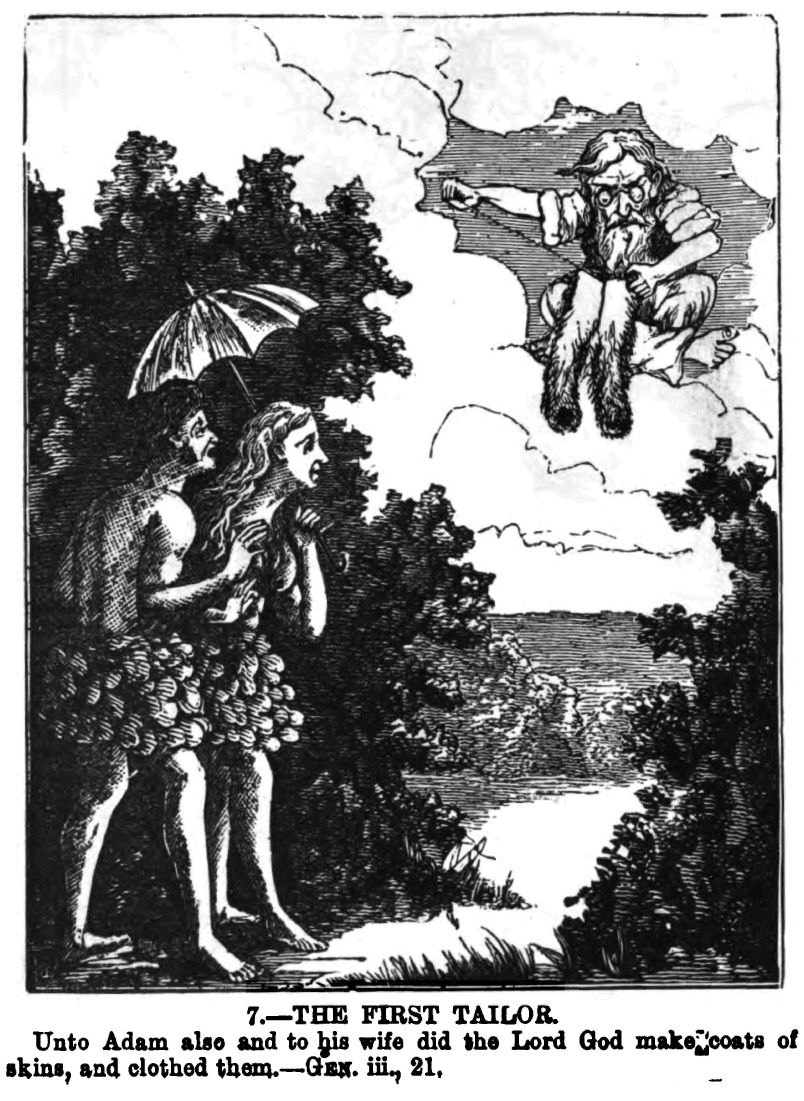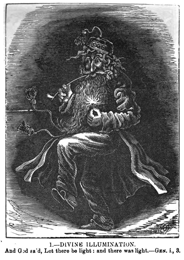 The same spirit has animated us in designing the pictures. Our object has been to take the Bible text always as our basis, to include no feature which is contradicted by it, and to introduce as many comicalities and anachronisms as possible consistently with this rule. We are therefore able to defy criticism. Bibliolators may vituperate us, persecute us, or imprison us, but they cannot refute us.. We can safely challenge them to prove that a single incident happened otherwise than we have depicted it. We can candidly say to them—"The thing must have happened in some way, as to which the Divine Word is silent; this is our view,—What is yours?" And we humbly submit that our speculations are as valid as our neighbors'. Nothing but the insanest bigotry in favor of their own conjectures could lead them to quarrel with us for expounding ours. If they can shame us with explicit disproofs from Holy Writ, let them do so; but what right have they to set up their carnal imaginings and uninspired theories as the ultimate criteria of truth?