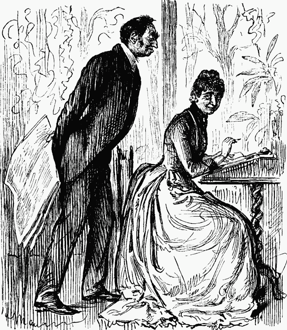 Elder Daughter (reading). "Views strictly orthodox." Oh, bother views! Here's something better—"Very Musical Voice"—the darling! He looks as if he had a musical voice. "Warranted not to go beyond fifteen minutes in preaching." Delicious!