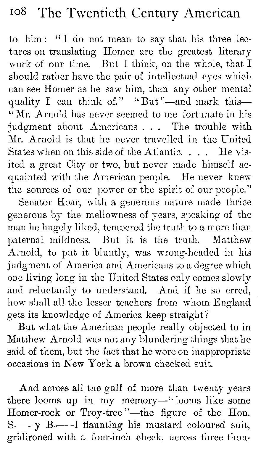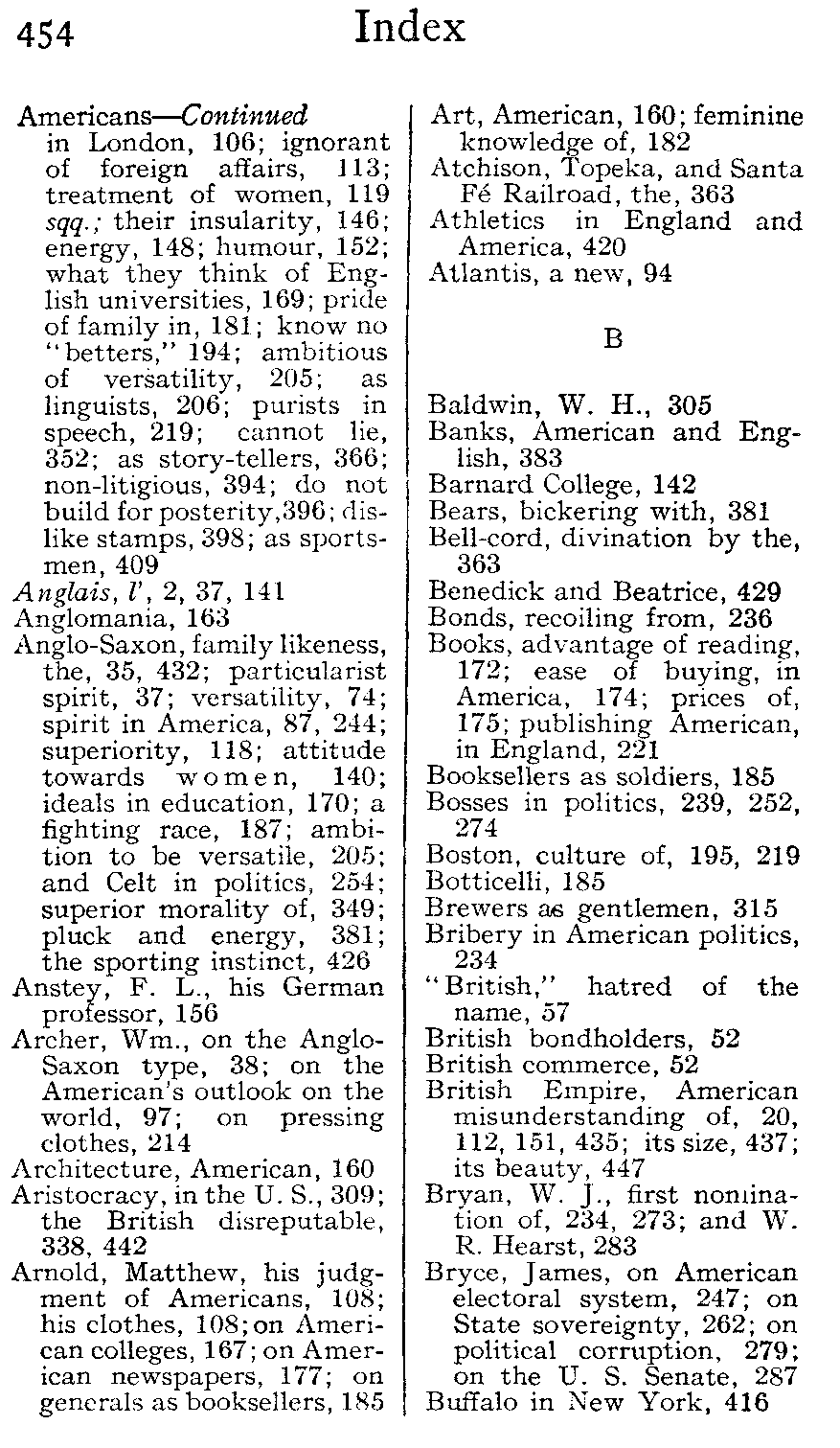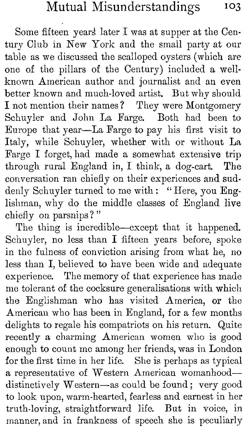 America's Bigness—A New Atlantis—The Effect of Expansion on a People—A Family Estranged—Parsnips—An American Woman in England—An Englishman in America—International Caricatures—Shibboleths: dropped H's and a "twang"—Matthew Arnold's Clothes—The Honourable S—— B——. |
