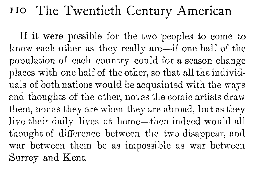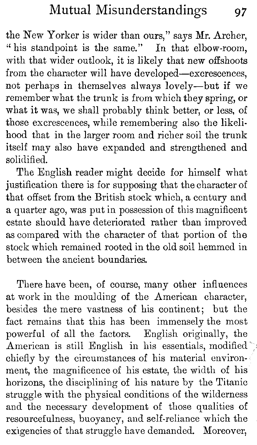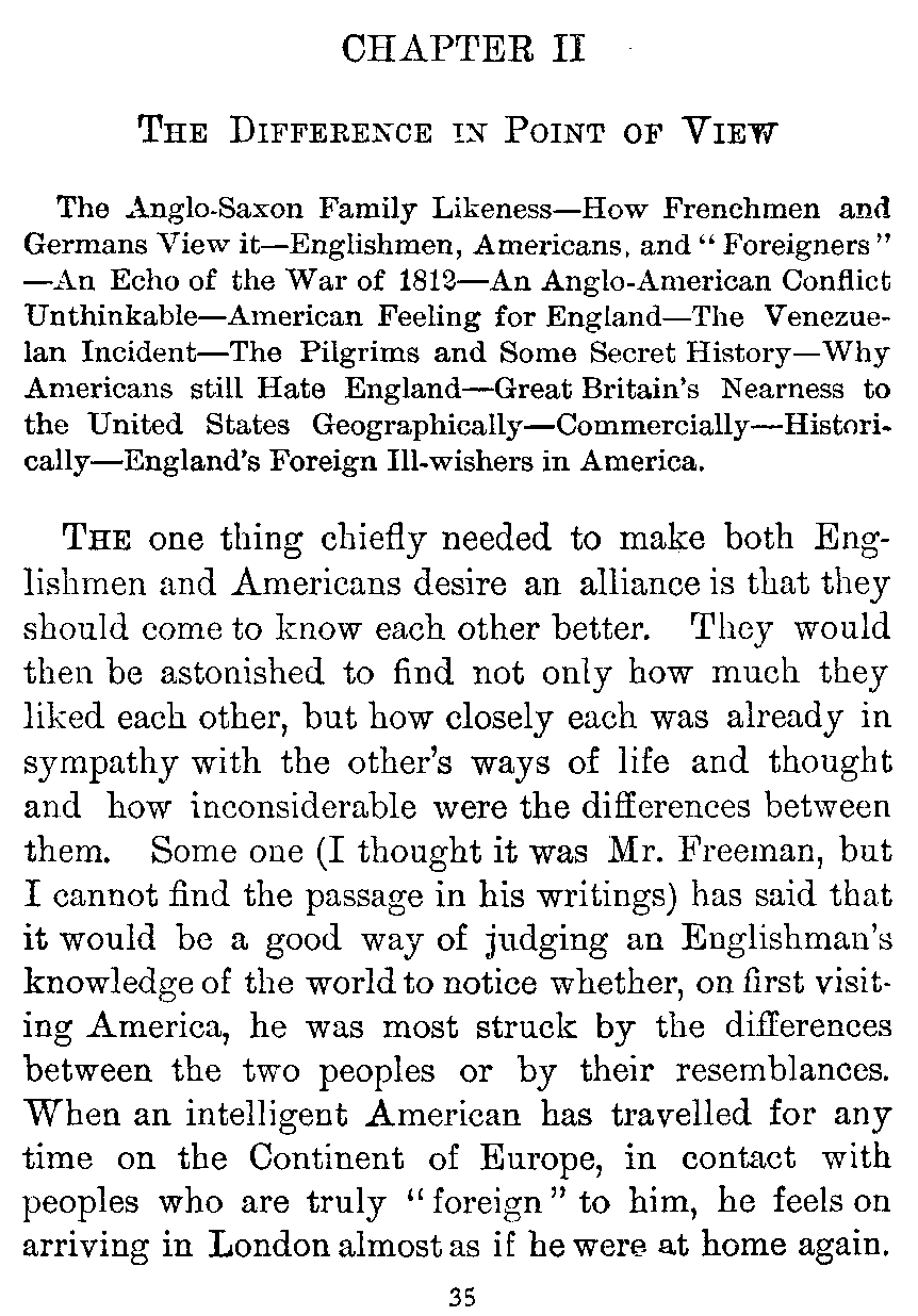 In the case of two peoples so much alike as the English and the American, between whom friendship and alliance would be so entirely in accord with eternal fitness, who are yet held apart by misunderstanding on the part of each of the other's character, there seems no better way than to face the misunderstandings frankly and to endeavour to make each see how unjustly it undervalues the other's good qualities or overestimates its faults. At present neither Americans nor Englishmen understand what good fellows the others are. [430]Least of all do they understand how essentially they are the same kind of good fellows.
