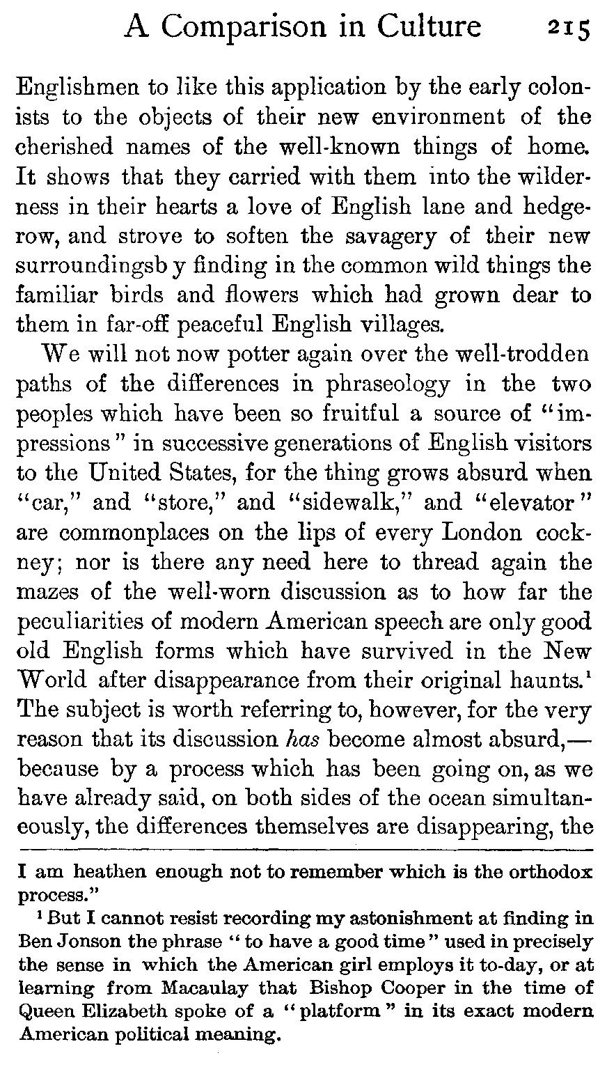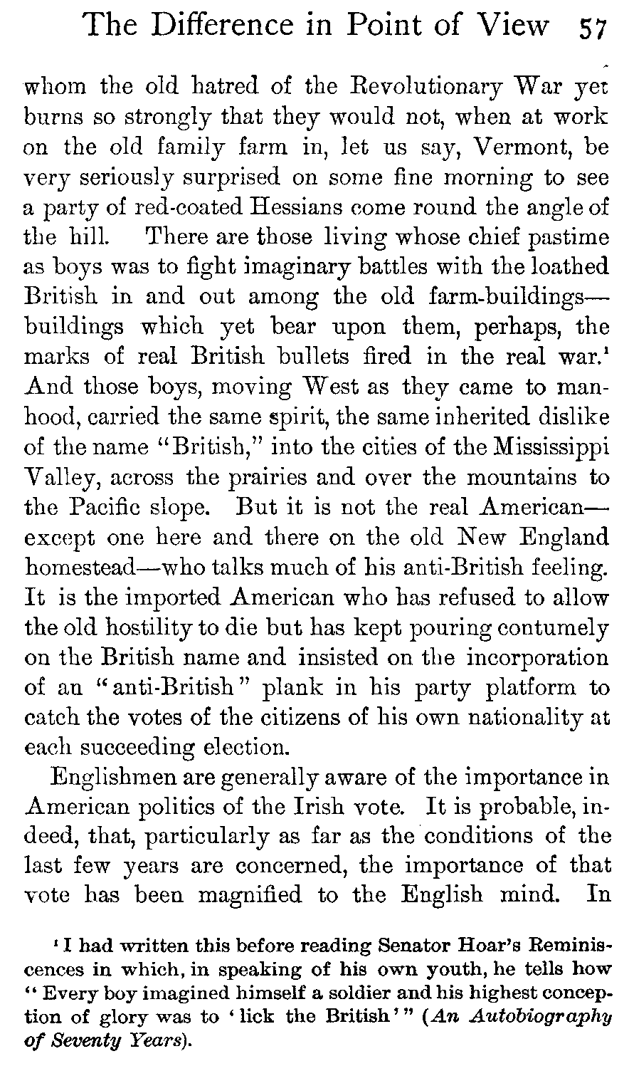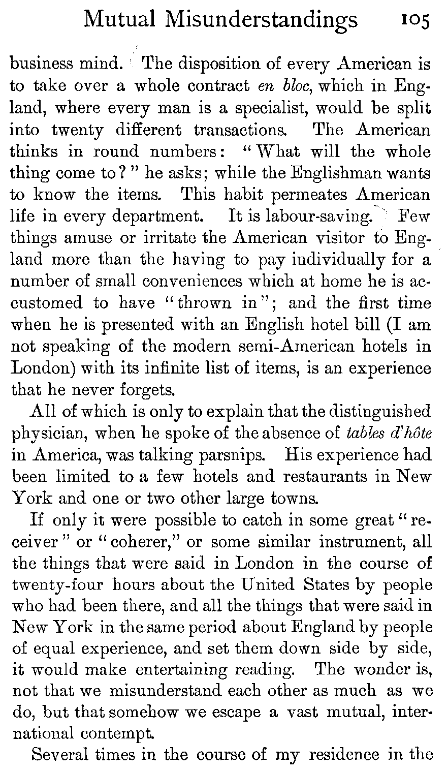 In the case of two peoples so much alike as the English and the American, between whom friendship and alliance would be so entirely in accord with eternal fitness, who are yet held apart by misunderstanding on the part of each of the other's character, there seems no better way than to face the misunderstandings frankly and to endeavour to make each see how unjustly it undervalues the other's good qualities or overestimates its faults. At present neither Americans nor Englishmen understand what good fellows the others are. [430]Least of all do they understand how essentially they are the same kind of good fellows.