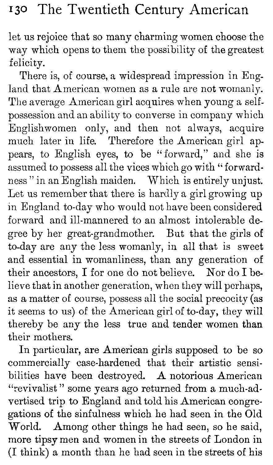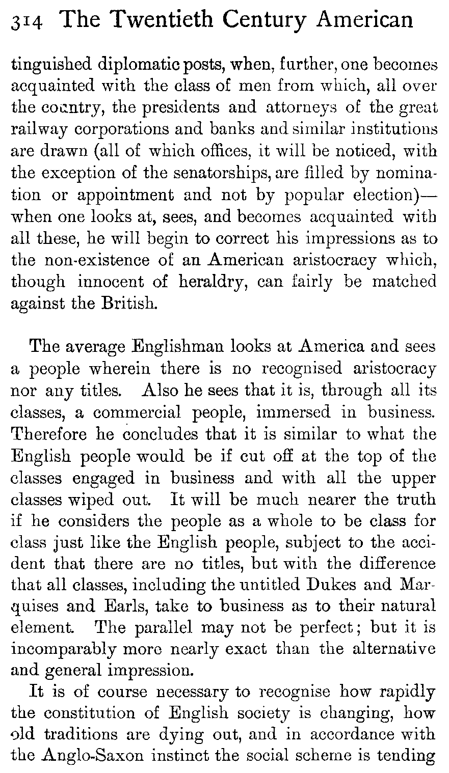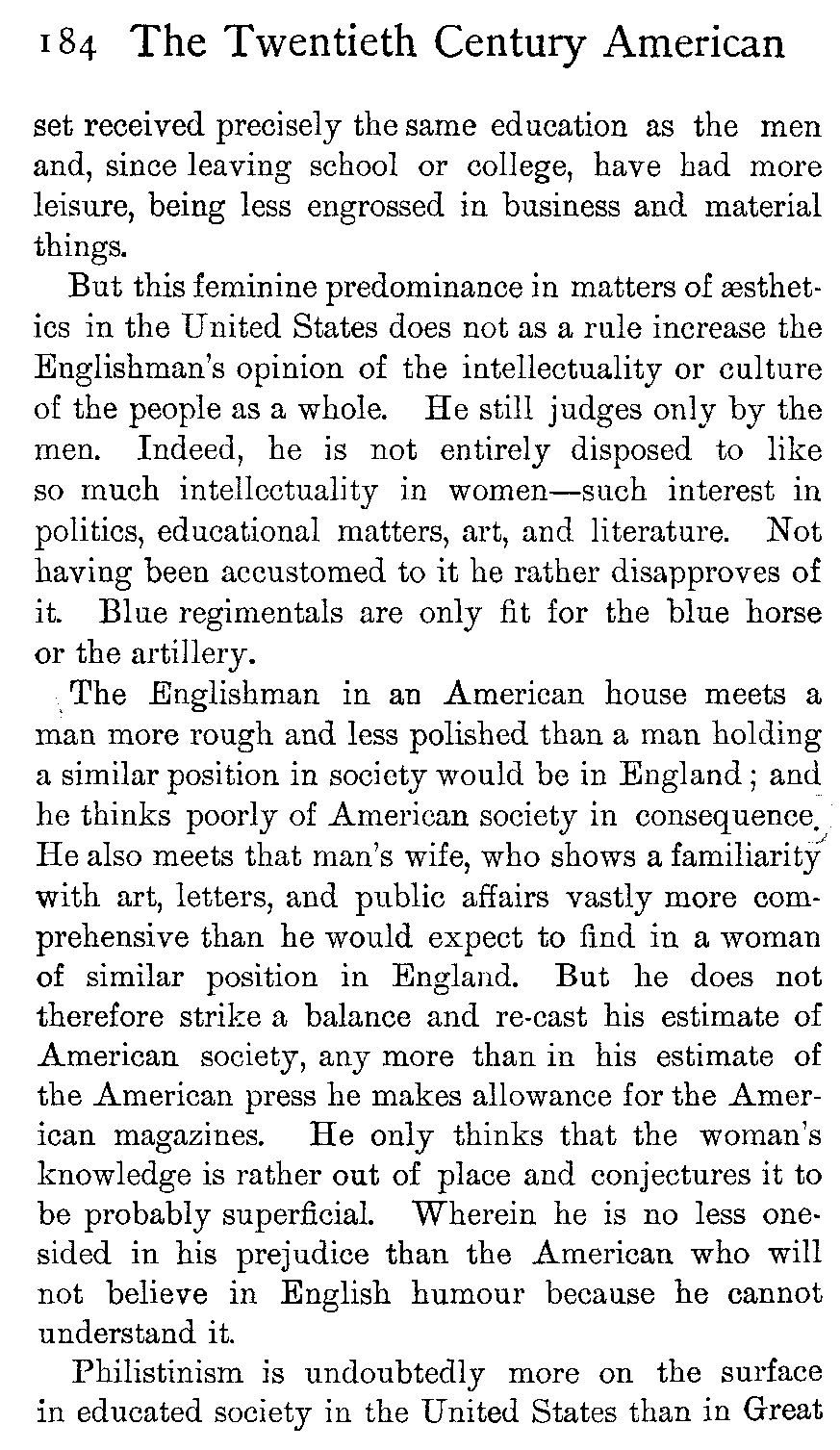 During all these years individual Americans have come to England in large numbers and have been duly noted and observed; but what the people of any nation notices in the casually arriving representatives of any other is not the points wherein the visitors resemble themselves, but the points of difference. In the case of Americans coming to England the fundamental traits are all resemblances and therefore escape notice, while only the differences—which by that very fact stand proclaimed as non-essentials—attract attention. So it is that the English people, having had acquaintance with a number of typical New Englanders, have drawn their conclusion as to the universality of one strong nasal American accent; they think the American people garrulously outspoken in criticism, with a rather offensive boastfulness, without any consciousness that precisely that same trait in themselves, in a slightly different form, is one of the chief causes why Englishmen are not conspicuously popular in any European country. From peculiarities of dress and manner which are not familiar to him in the product of his own public schools and universities, the Englishman has been inclined to think that the American people is not, even in its "better classes," a population of gentlemen.