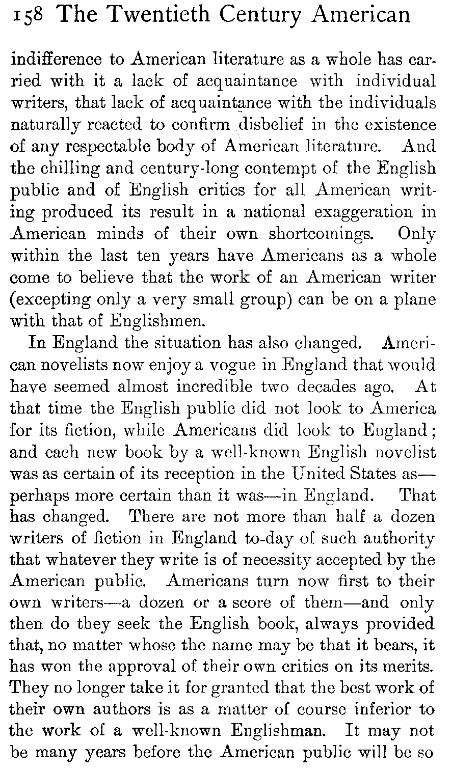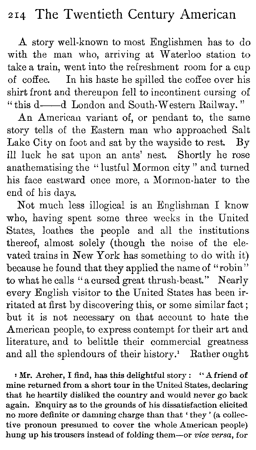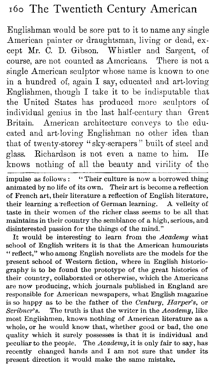 And I have said that, in holding these ideas, the Americans do but make a fair exchange of discourtesies; for the Englishman has likewise queer notions of the typical American. There is always this vast difference, however, that the Englishman is predisposed to like the American. In spite of his ignorance he feels a great—and, in view of that ignorance, an almost inexplicable—good-will for him. But it is not inexplicable, for once more the causes of his misapprehensions are easily traced.