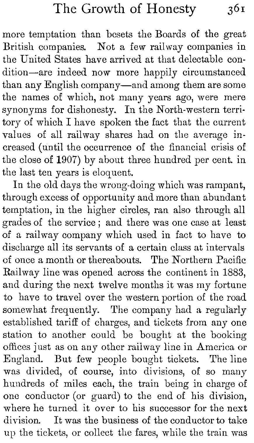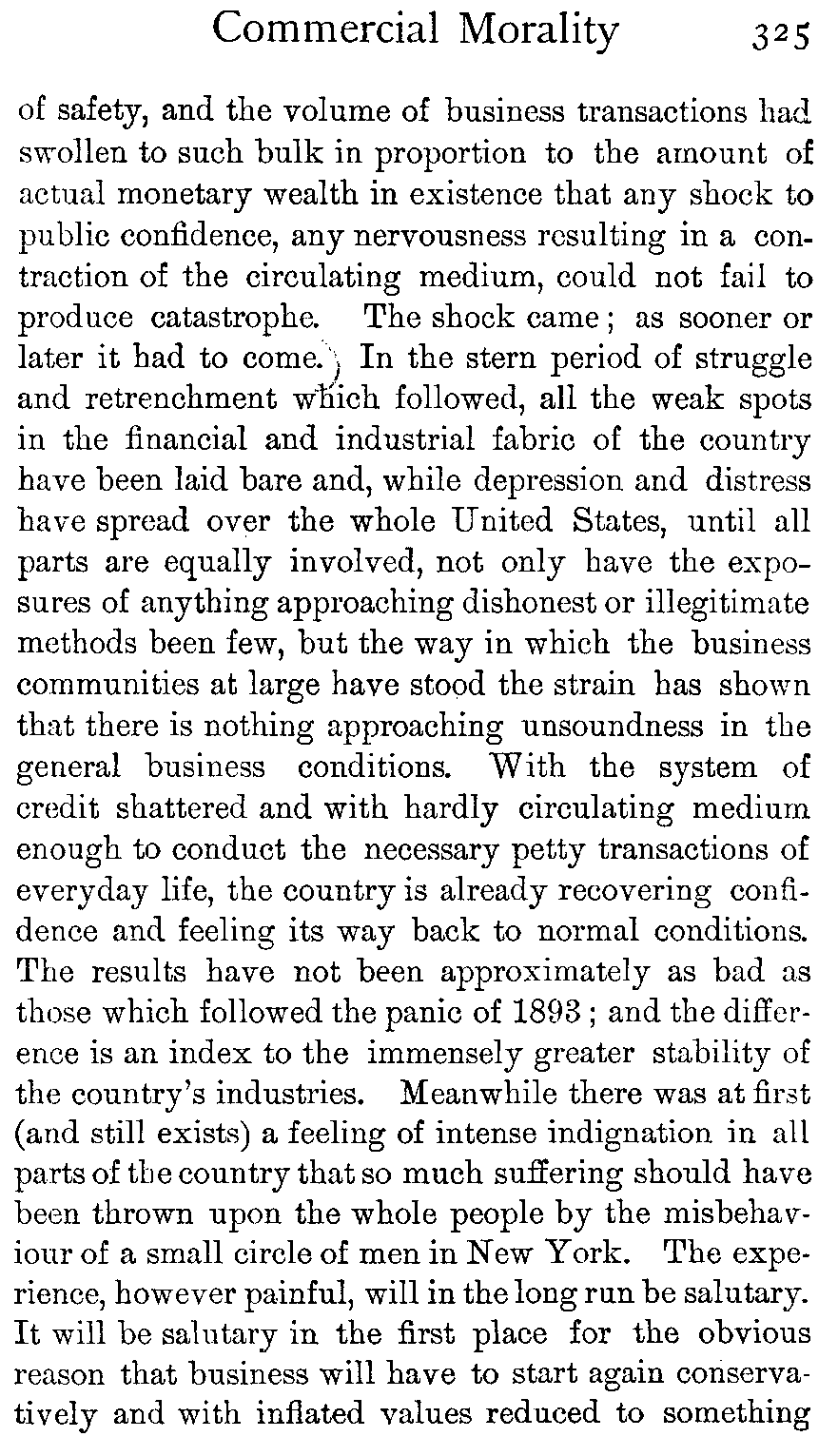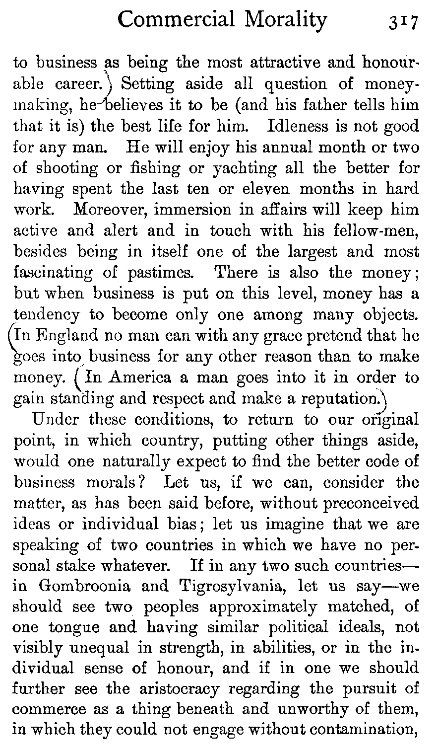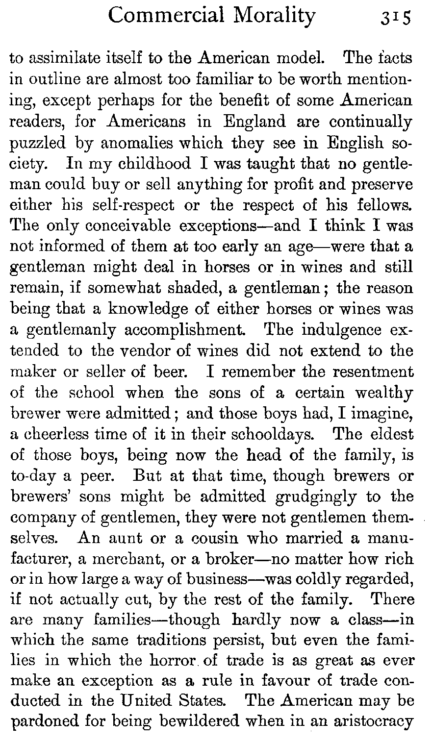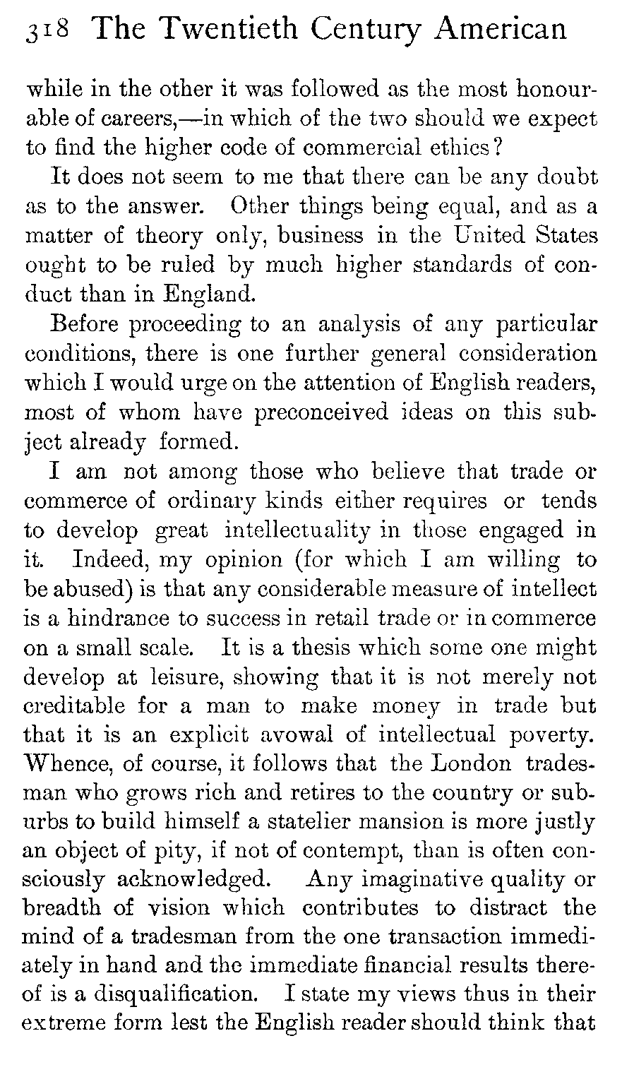Whenever a financial fraud of a large size is discovered in America, the world is told of it, just as certainly as it is told when an English peer finds his way to the divorce court; but nobody expounds to the nations the excellence of the honourable lives which are led by most American millionaires, any more than the world is kept informed of the drab virtue of the majority of the British aristocracy. Wherefore the English people have come to think of American business ethics as being too often of the shadiest; whereas they ought on reflection to be aware that only in most exceptional cases can great or permanent individual commercial success be won by fraud, and that nothing but fundamental honesty will serve as the basis for a great national trade such as the United States has built up.