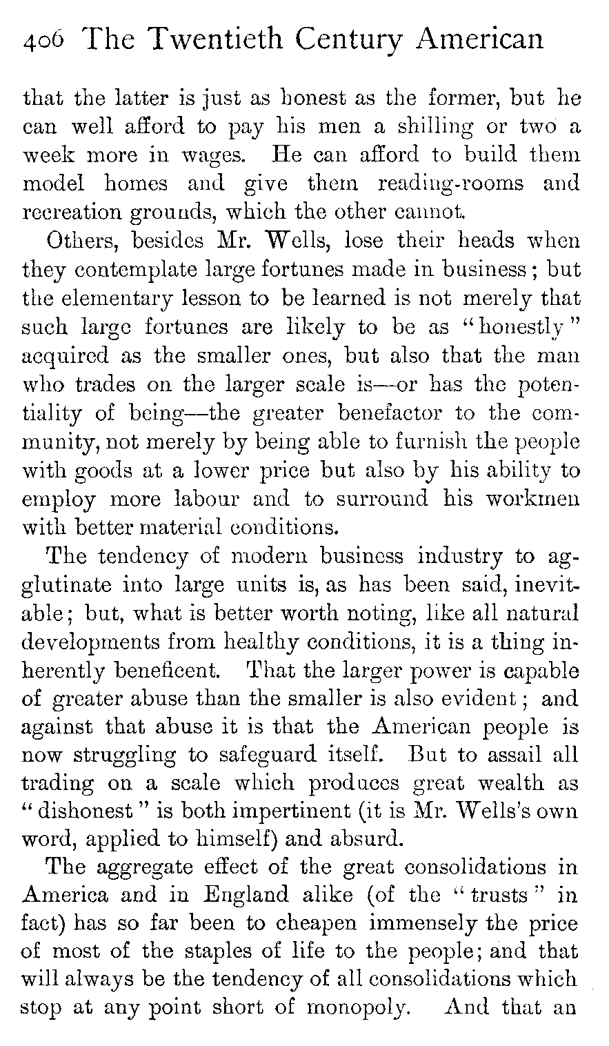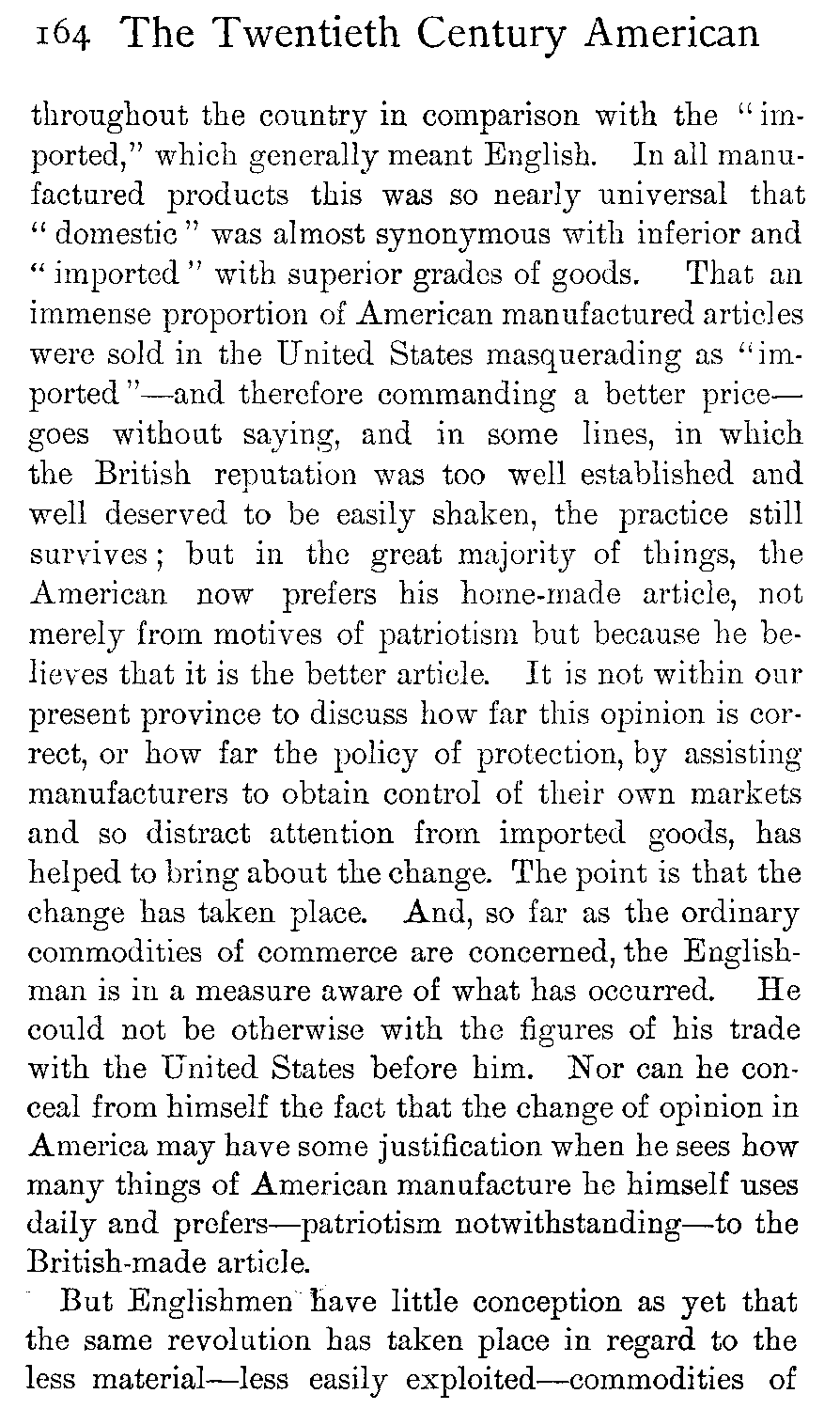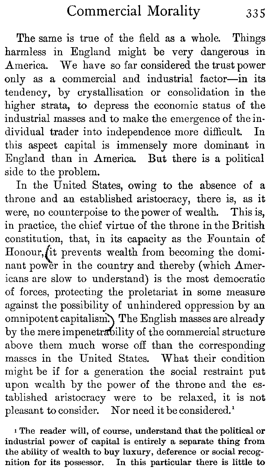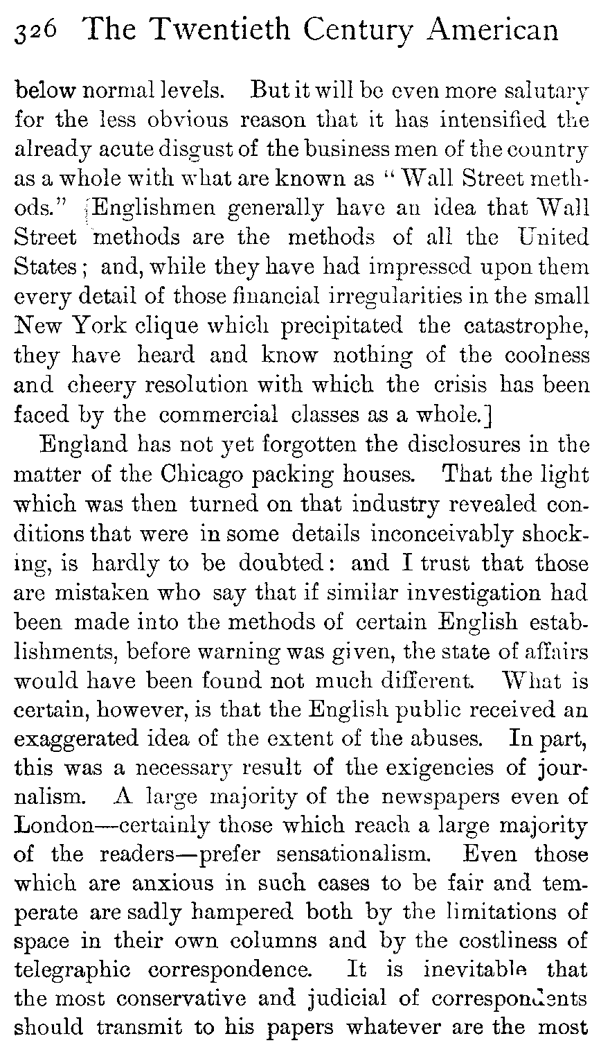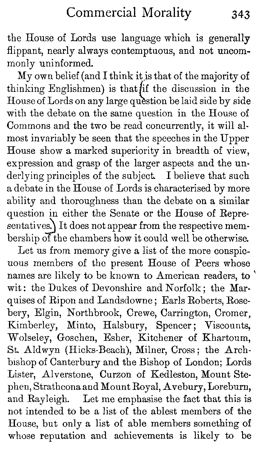 Whenever a financial fraud of a large size is discovered in America, the world is told of it, just as certainly as it is told when an English peer finds his way to the divorce court; but nobody expounds to the nations the excellence of the honourable lives which are led by most American millionaires, any more than the world is kept informed of the drab virtue of the majority of the British aristocracy. Wherefore the English people have come to think of American business ethics as being too often of the shadiest; whereas they ought on reflection to be aware that only in most exceptional cases can great or permanent individual commercial success be won by fraud, and that nothing but fundamental honesty will serve as the basis for a great national trade such as the United States has built up.