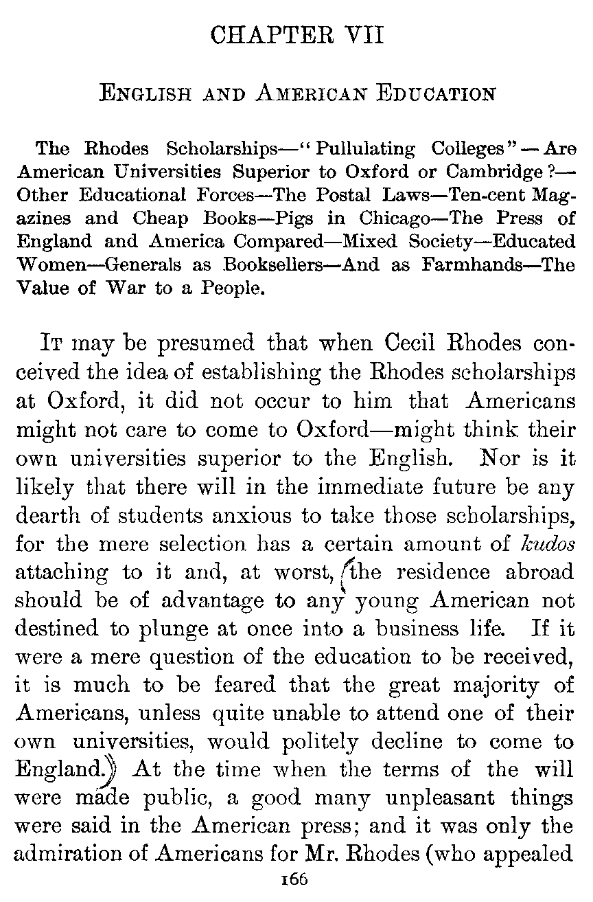 The Rhodes Scholarships—"Pullulating Colleges"—Are American Colleges Superior to Oxford or Cambridge?—Other Educational Forces—The Postal Laws—Ten-cent Magazines and Cheap Books—Pigs in Chicago—The Press of England and America Compared—Mixed Society—Educated Women—Generals as Booksellers—And as Farmhands—The Value of War to a People. |