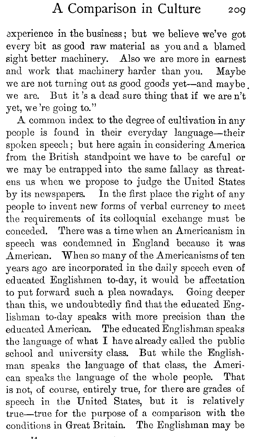 Finally Englishmen read American newspapers and, not understanding the different relation in which those newspapers stand to the people, they compare with them the normal English papers and draw inferences which are quite unjust. Similar inferences no less unjust may be drawn from hearing the speech of a certain number of well-to-do Americans, belonging, as Englishmen opine, to the class of "gentlemen."