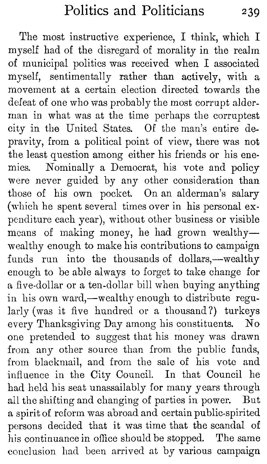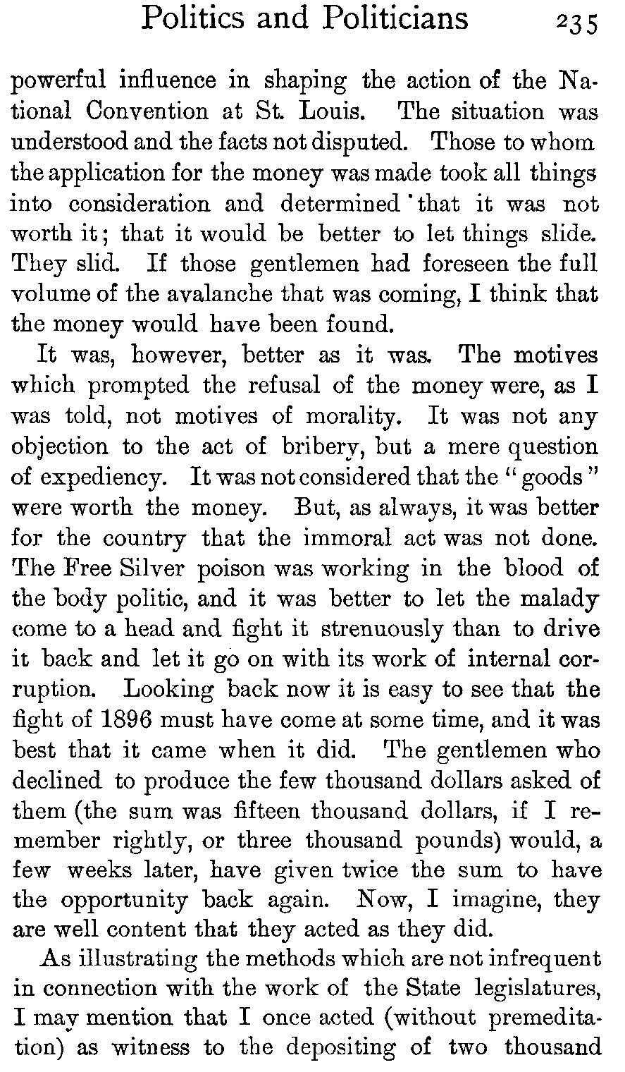The "English-American" Vote—The Best People in Politics—What Politics Means in America—Where Corruption Creeps in—The Danger in England—A Presidential Nomination for Sale—Buying Legislation—Could it Occur in England?—A Delectable Alderman—Taxation while you Wait—Perils that England Escapes—The Morality of Congress—Political Corruption of the Irish—Democrat and Republican. |
