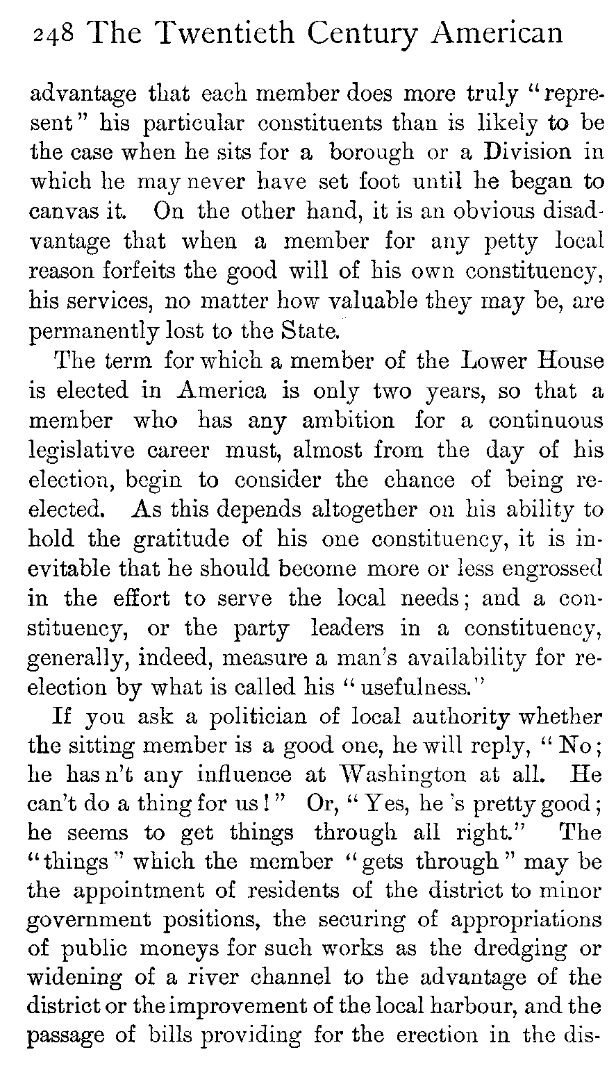 Moreover, many Englishmen go to the United States—the vast majority for a stay of a few days or weeks, or a month or two—and they tell their friends, or the public at large in print, all about America and its [441]people. It is not given to every one to be able, in the course of a few weeks or a month or two, to see below the surface indications down to the root-traits of a people—a feat which becomes of necessity the more difficult when those root-traits are one's own root-traits and the fundamental traits of one's own people at home, while on the surface are all manner of queer, confusing dazzlements of local peculiarities which jump to the stranger's vision and set him blinking. Yet more difficult does the feat appear when it is realised that the American people is scattered over a continent some three thousand miles across—so that San Francisco is little nearer to New York than is Liverpool—and that the section of the people with whom the Englishman necessarily comes first and, unless he penetrates both far and deep into the people, most closely in contact is precisely that class from which it is least safe to draw conclusions as to the thoughts, manners, or politics of the people as a whole. Therefore it is that one of the most acute observers informed Europe that in America "a gentleman had only to take to politics to become immediately déclassé"—which, speaking of the politics of the country as a whole, is purely absurd. The visiting Englishman has generally found the whole sphere of municipal and local politics a novel field to him and has naturally been interested. Probing it, he comes upon all manner of tales of corruption and wickedness. He does not see that the body of American "politics," as the word is understood in England, is moderately free from these taints, but he tells the world of the corruption in that sphere of politics which he has studied merely because it does not exist at home and is new to him; and all [442]the world knows that American politics are indescribably corrupt.