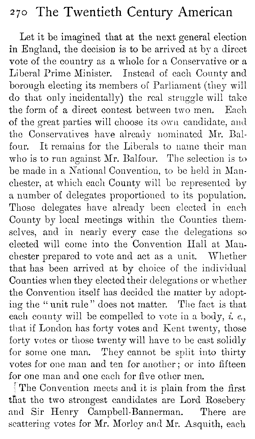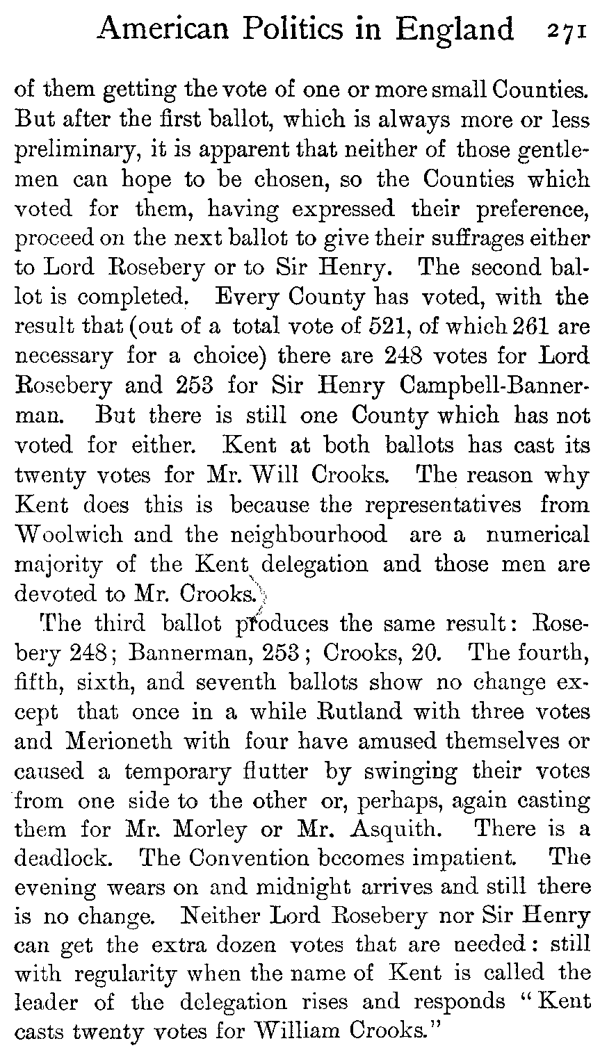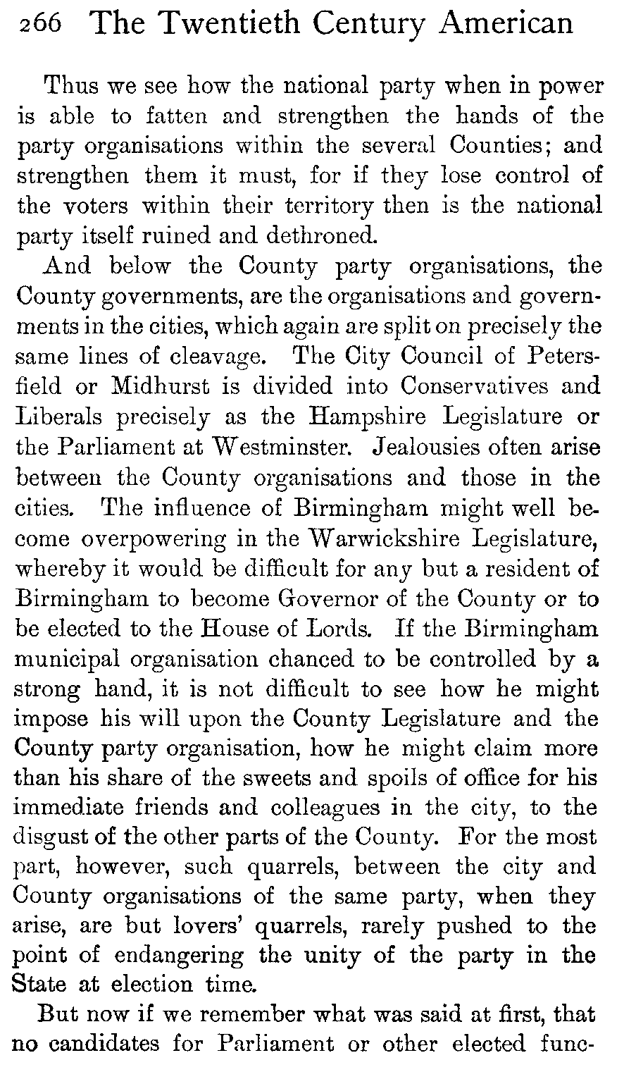 The System of Parties—Interdependence of National and Local Organisations—The Federal Government and Sovereign States—The Boss of Warwickshire—The Unit System—Prime Minister Crooks—Lanark and the Nation—New York and Tammany Hall—America's Superior Opportunities for Wickedness—How England Is Catching up—Campaign Reminiscences—The "Hell-box"—Politics in a Gravel-pit—Mr. Hearst and Mr. Bryan. |