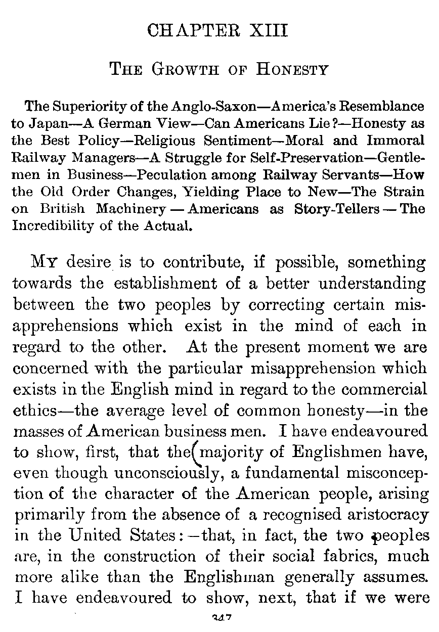 The Superiority of the Anglo-Saxon—America's Resemblance to Japan—A German View—Can Americans Lie?—Honesty as the Best Policy—Religious Sentiment—Moral and Immoral Railway Managers—A Struggle for Self-preservation—Gentlemen in Business—Peculation among Railway Servants—How the Old Order Changes, Yielding Place to New—The Strain on British Machinery—Americans as Story-Tellers—The Incredibility of the Actual. |