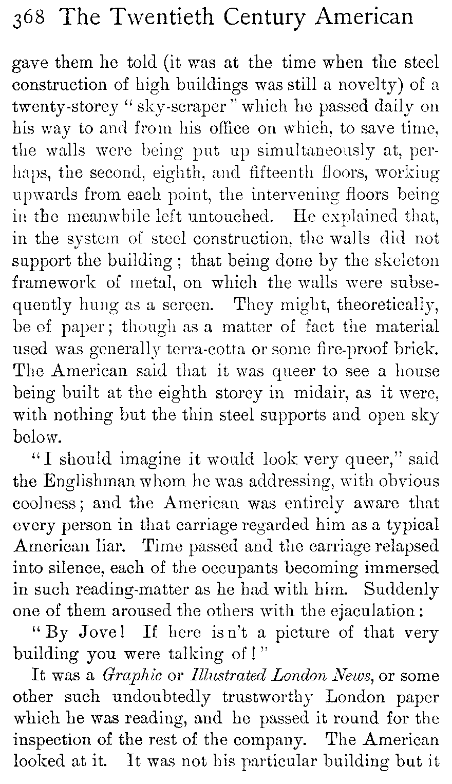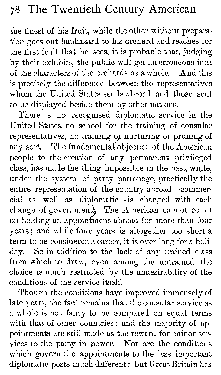First, there has been the eternal pre-occupation of the English people with the affairs of other parts of the world. When Great Britain has been so inextricably involved with the policies of all the earth that almost any day news might come from Calcutta, from Berlin, from St. Petersburg, from Pekin, or Teheran, or from almost any point in Asia, Africa, or Australia, which would shake the Empire to its foundation, how could [440]the people spare time to become intimately acquainted with the United States? Of coarse Englishmen talk of the "State of Chicago," and—as I heard an English peasant not long ago—of "Yankee earls."