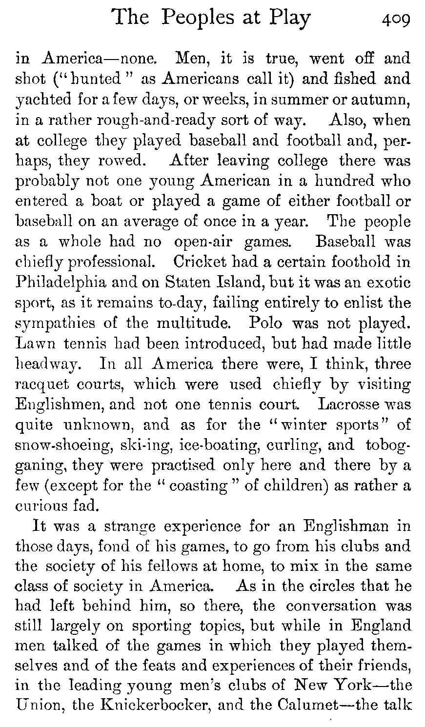 This of course does not touch the fact—which is a fact—that in America what answers to the gentleman-amateur in England is drawn from a much larger proportion of the people. This does not however mean, when rightly viewed, what Englishmen generally think it means, that Americans go down into other—and presumably not legitimate—classes for their recruits. It only means that a very much larger proportion of the people belong to one class. There is no point at which an arbitrary line can be drawn. This is in truth only another way of saying what has been said already more than once, that the American people is really more homogeneous than the English, or rather is homogeneous over a larger part of its area, so that the type-American represents a greater proportion of the people of the United States than the type-Briton represents of the people of the British Isles.