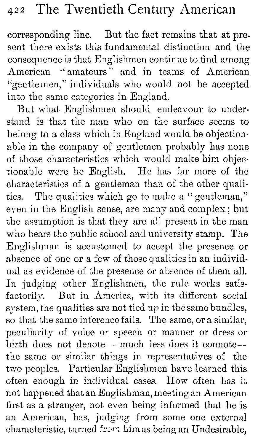 But what Englishmen should endeavour to understand is that the man who on the surface seems to belong to a class which in England would be objectionable in the company of gentlemen probably has none of those characteristics which would make him objectionable were he English. He has far more of the characteristics of a gentleman than of the other qualities. The qualities which go to make a "gentleman," even in the English sense, are many and complex; but the assumption is that they are all present in the man who bears the public school and university stamp. The Englishman is accustomed to accept the presence or absence of one or a few of those qualities in an individual as evidence of the presence or absence of them all. In judging other Englishmen, the rule works satisfactorily. But in America, with its different social system, the qualities are not tied up in the same bundles, so that the same inference fails. The same, or a similar, peculiarity of voice or speech or manner or dress or birth does not denote—much less does it connote—the same or similar things in representatives of the two peoples. Particular Englishmen have learned this often enough in individual cases. How often has it not happened that an Englishman, meeting an American first as a stranger, not even being informed that he is an American, has, judging from some one external characteristic, turned from him as being an Undesirable, [423]only to be introduced to him later, or meet him under other conditions, and find in him one of the best fellows that he ever met? The thing is happening every day. Very often, with a little more knowledge or a little clearer understanding, Englishmen would know that their judgment of some American amateur athlete is shockingly unjust. To bar him out would be incomparably more unjust to him than his inclusion is unjust to any antagonist.