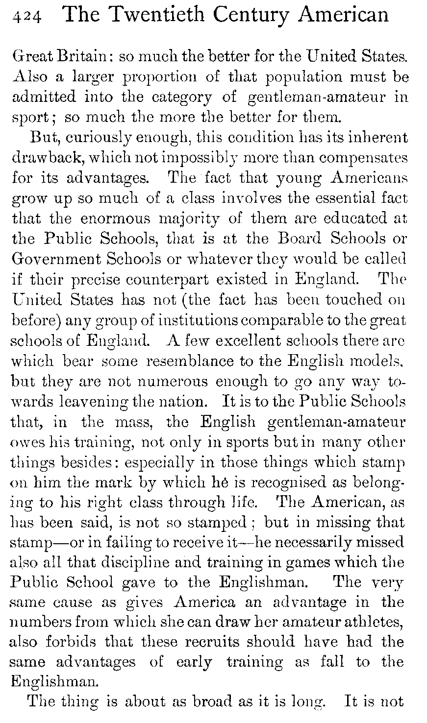 But, curiously enough, this condition has its inherent drawback, which not impossibly more than compensates for its advantages. The fact that young Americans grow up so much of a class involves the essential fact that the enormous majority of them are educated at the Public Schools, that is at the Board Schools or Government Schools or whatever they would be called if their precise counterpart existed in England. The United States has not (the fact has been touched on before) any group of institutions comparable to the great schools of England. A few excellent schools there are which bear some resemblance to the English models, but they are not numerous enough to go any way towards leavening the nation. It is to the Public Schools that, in the mass, the English gentleman-amateur owes his training, not only in sports but in many other things besides: especially in those things which stamp on him the mark by which he is recognised as belonging to his right class through life. The American, as has been said, is not so stamped; but in missing that stamp—or in failing to receive it—he necessarily missed also all that discipline and training in games which the Public School gave to the Englishman. The very same cause as gives America an advantage in the numbers from which she can draw her amateur athletes, also forbids that these recruits should have had the same advantages of early training as fall to the Englishman.