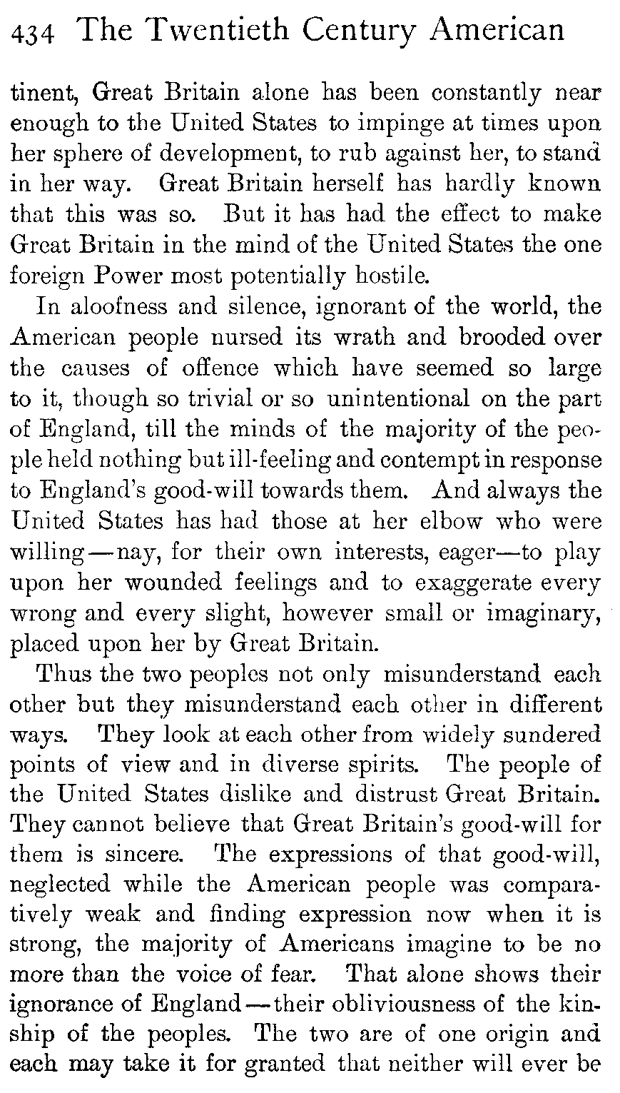 For the United States had had no such constant burden of anxiety, no perpetual friction with other peoples, to keep her occupied. Rather, sitting aloof in her isolation she had looked upon all the Powers of Europe as actors in a great drama with which she had no other than a spectacular concern. Only of all the Powers, by the very accident of common origin, by the mere circumstances of the joint occupation of the [434]continent, Great Britain alone has been constantly near enough to the United States to impinge at times upon her sphere of development, to rub against her, to stand in her way. Great Britain herself has hardly known that this was so. But it has had the effect to make Great Britain in the mind of the United States the one foreign Power most potentially hostile.