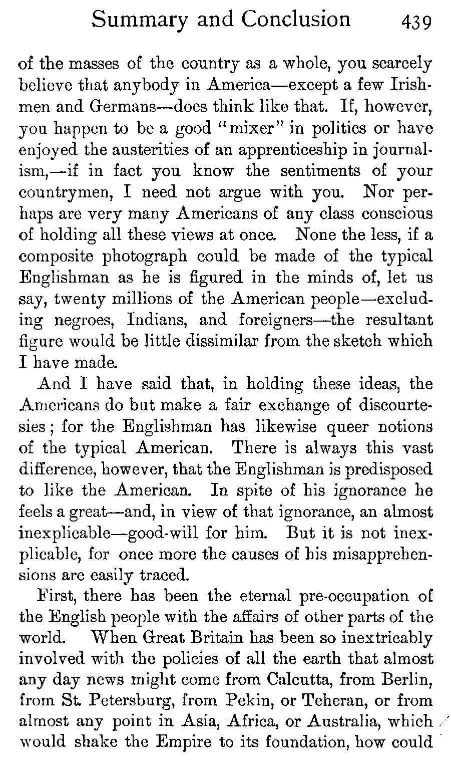 I am well aware that many American readers will say: "What is the man talking of? I do not think of Englishmen like that!" Of course you do not, excellent and educated reader—especially if you have travelled much in Great Britain or if you are a member of those refined and cultured classes (what certain American democrats would call the "silk-stocking element") which constitute the select and entirely charming society of most of the older cities of the Atlantic seaboard as well as of some of the larger communities throughout the country. If, belonging to those classes, you do not happen to have made it your business, either as a politician or a newspaper man, to be in close touch with the real sentiments [439]of the masses of the country as a whole, you scarcely believe that anybody in America—except a few Irishmen and Germans—does think like that. If, however, you happen to be a good "mixer" in politics or have enjoyed the austerities of an apprenticeship in journalism,—if in fact you know the sentiments of your countrymen, I need not argue with you. Nor perhaps are very many Americans of any class conscious of holding all these views at once. None the less, if a composite photograph could be made of the typical Englishman as he is figured in the minds of, let us say, twenty millions of the American people—excluding negroes, Indians, and foreigners—the resultant figure would be little dissimilar from the sketch which I have made.