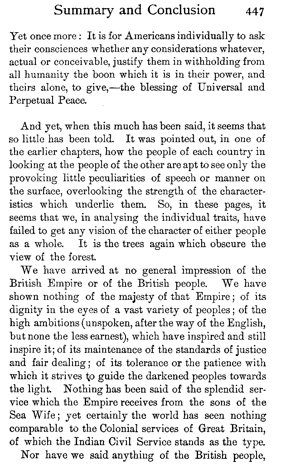 These misunderstandings do less harm to the Englishman than to the American, inasmuch as the Englishman has that predisposition to national cordiality which the American has not. But, though the Englishman's mistakes do not influence his good-will to the United States, though he himself attaches no serious importance to them, his utterance of them is taken seriously by the Americans themselves and does not tend to the promotion of international good feeling. Therefore it is that it is no less desirable that English misconceptions of the United States should [444]be corrected than it is that the American people should be brought to a juster appreciation of the British character and Empire.