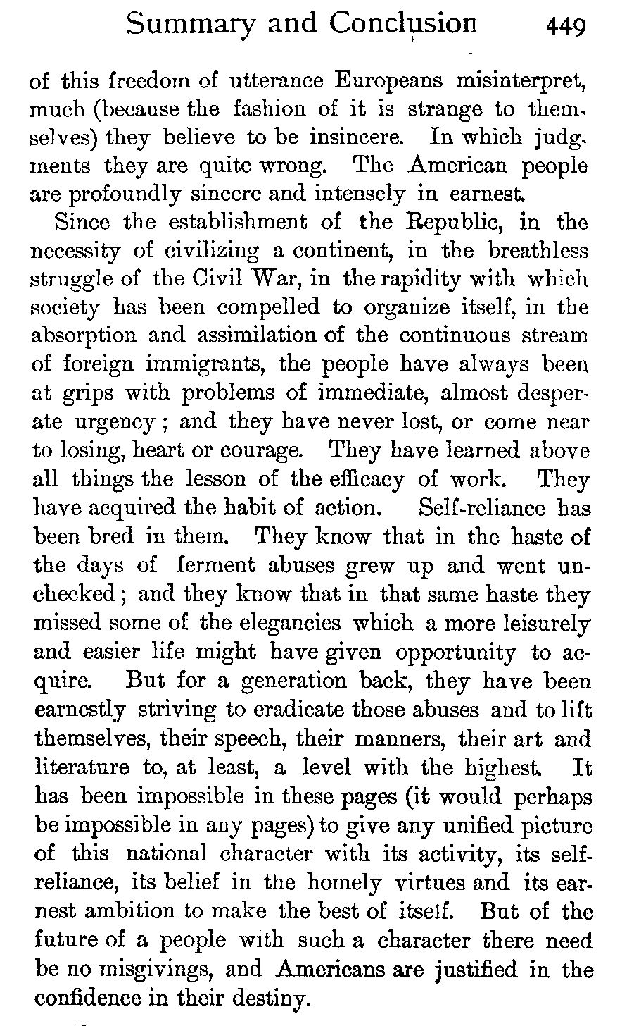 Since the establishment of the Republic, in the necessity of civilizing a continent, in the breathless struggle of the Civil War, in the rapidity with which society has been compelled to organize itself, in the absorption and assimilation of the continuous stream of foreign immigrants, the people have always been at grips with problems of immediate, almost desperate urgency; and they have never lost, or come near to losing, heart or courage. They have learned above all things the lesson of the efficacy of work. They have acquired the habit of action. Self-reliance has been bred in them. They know that in the haste of the days of ferment abuses grew up and went unchecked; and they know that in that same haste they missed some of the elegancies which a more leisurely and easier life might have given opportunity to acquire. But for a generation back, they have been earnestly striving to eradicate those abuses and to lift themselves, their speech, their manners, their art and literature to, at least, a level with the highest. It has been impossible in these pages (it would perhaps be impossible in any pages) to give any unified picture of this national character with its activity, its self-reliance, its belief in the homely virtues and its earnest ambition to make the best of itself. But of the future of a people with such a character there need be no misgivings, and Americans are justified in the confidence in their destiny.