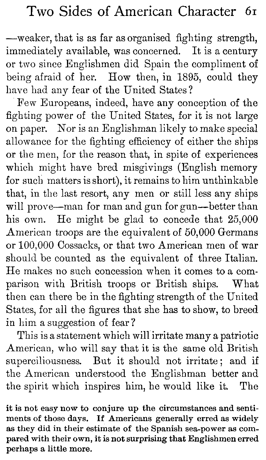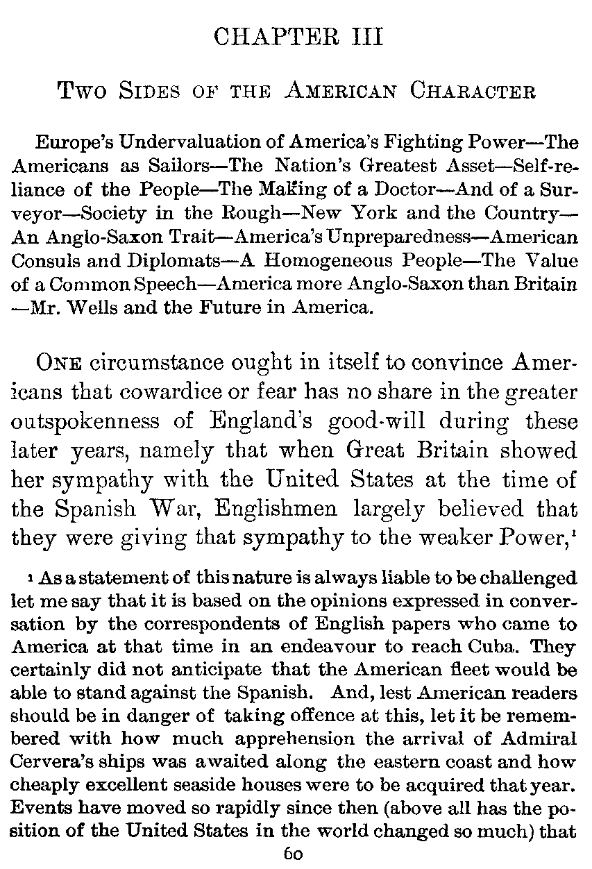 Europe's Undervaluation of America's Fighting Power—The Americans as Sailors—The Nation's Greatest [viii]Asset—Self-reliance of the People—The Making of a Doctor—And of a Surveyor—Society in the Rough—New York and the Country—An Anglo-Saxon Trait—America's Unpreparedness—American Consuls and Diplomats—A Homogeneous People—The Value of a Common Speech—America more Anglo-Saxon than Britain—Mr. Wells and the Future in America. |
