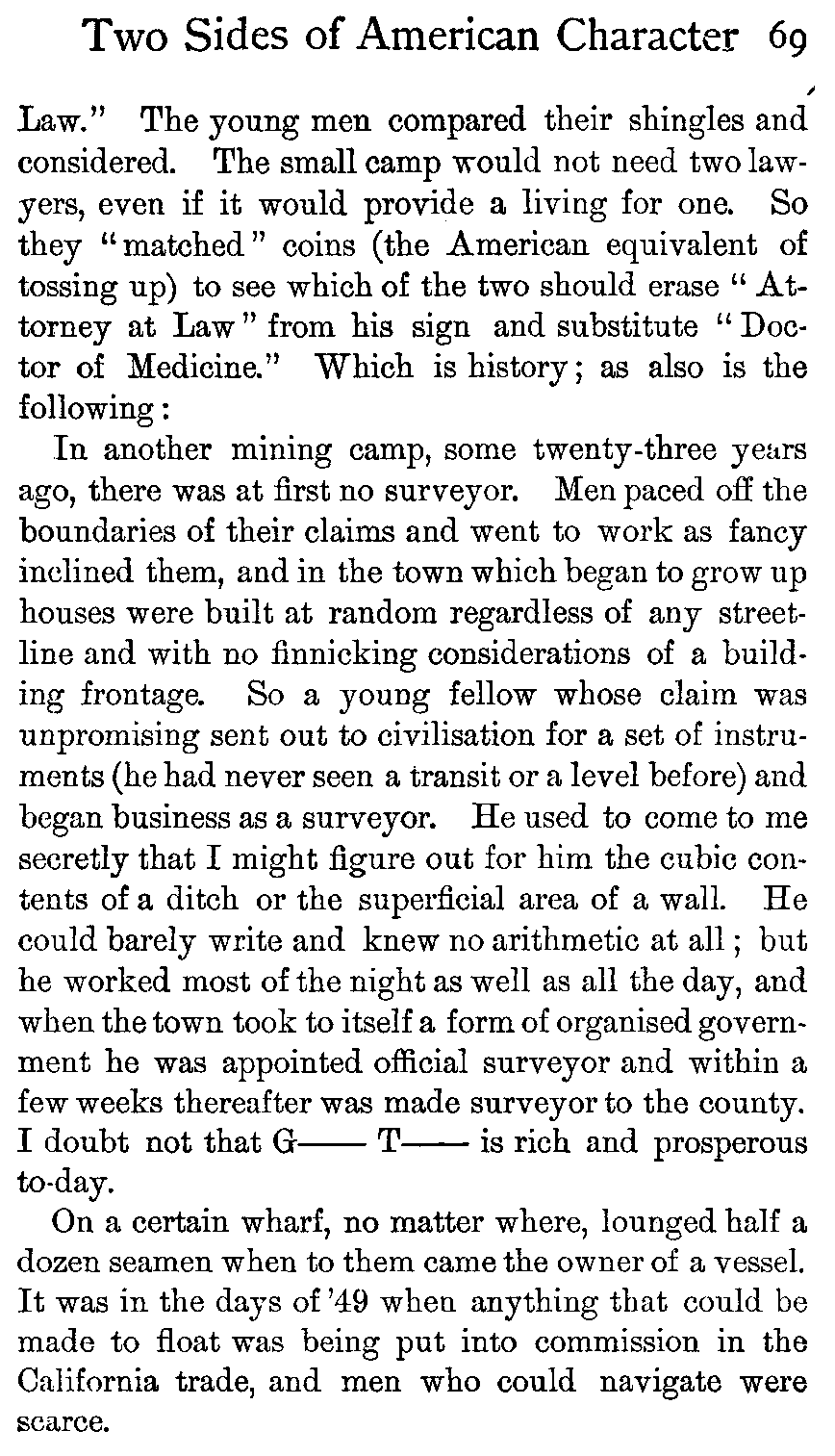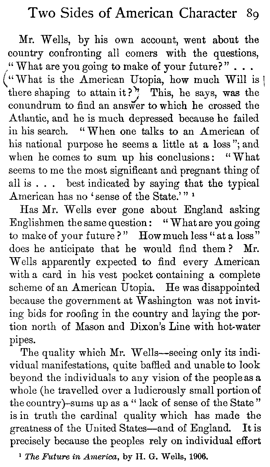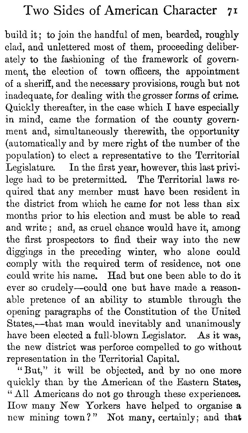 It may be that, living in the silences and solitudes of the frontier and the wilderness, they have found the greater need of ready speech when communication has offered. It may be that the mere necessity of planning together the framework of their society and of building up their State out of chaos has imposed on them the necessity of more outspokenness. Certainly they have discarded, or have not assumed, the reticence of the modern English of England; and much [449]of this freedom of utterance Europeans misinterpret, much (because the fashion of it is strange to themselves) they believe to be insincere. In which judgments they are quite wrong. The American people are profoundly sincere and intensely in earnest.