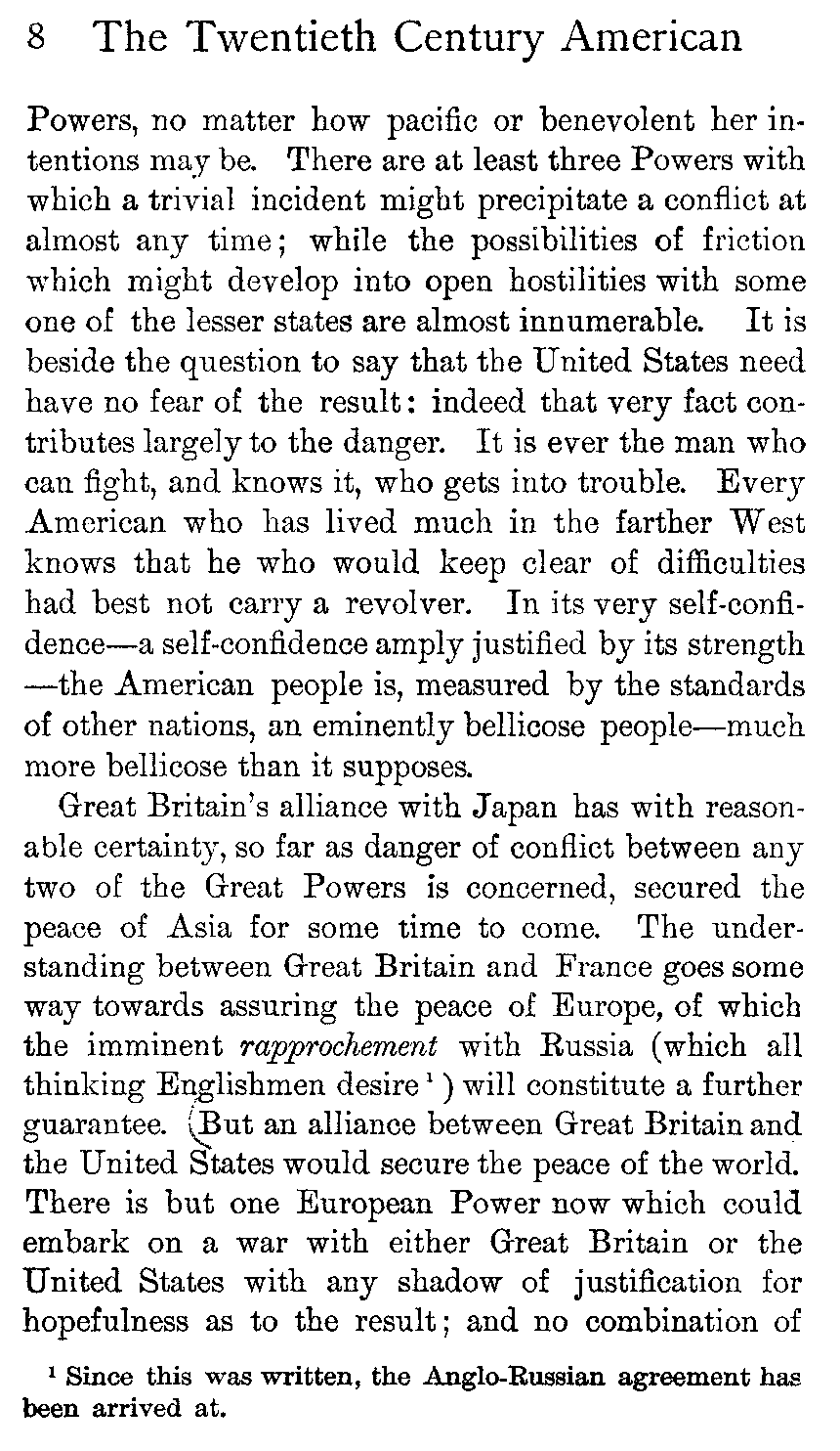 In summarising the contents of the foregoing pages, there is no need here to rehearse, except in barest outline, the arguments in favour of alliance between the countries. The fact that war between them is an ever-present possibility ought in itself to suffice—war which could hardly fail to be more sanguinary and destructive than any war that the world has known. The danger of such a war is greater, perhaps, than the people of either country recognises, certainly greater than most Englishmen imagine. The people of England do not understand the warlike—though so peace-loving—character of the American nation. It is just as warlike as, though no less peace-loving than, the English, without the restraint of that good-will which the English feel for the United States; without, moreover, the check, to which every European country is always subjected, of the fear of complications with other Powers. The American people, as a whole, it cannot be too earnestly impressed on Englishmen, have no such good-will towards Great Britain as Englishmen feel for them; and not even English reluctance to draw the sword, nor the protests of the better informed and the more well-to-do people in the United States would be able to restrain what Mr. Cleveland calls "the plain people of the land" if they once made up their mind to fight.