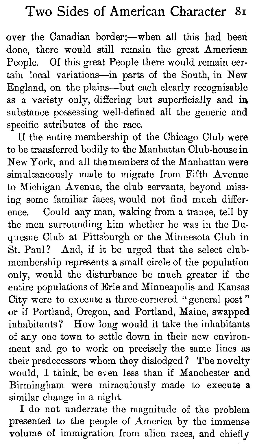This book was almost ready for the press when Dr. Albert Shaw's collection of essays was published under the title of The Outlook for the Average Man. Dr. Shaw is one of America's most lucid thinkers and he contributes what I take to be a new (though once stated an obviously true) explanation of what I have spoken of as the homogeneousness of the American people. The West, as we all know, was largely settled from the East. That is to say that a family or a member of a family in New York moved westward to Illinois, thence in the next generation to Minnesota, thence again to Montana or Oregon. A similar movement went on down the whole depth of the United States, families established in North Carolina migrating first to Kentucky, then to Ohio, so to Texas, and finally on to California. All parts of the country therefore have, as the nucleus of their population, people of precisely the same stock, habits, and ways of thought. The West was settled "not by radiation of influence from the older centres, but by the actual transplantation of the men and women." Dr. Shaw proceeds: