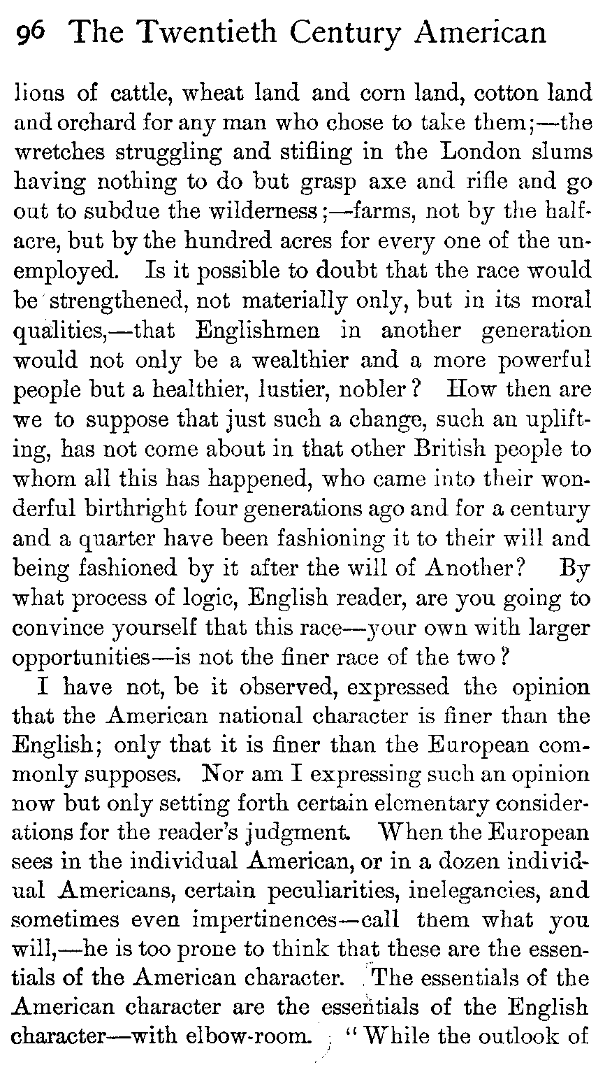 "The result of the organisation of the American colonies into a state, and of the bringing together of the diverse communities contained in these colonies, was the creation not merely of a new nation, but of a new temperament. How far this temperament was to arise from a change of climate, and how far from a new political organisation, no one could then foresee, nor is its origin yet fully analysed; but the fact itself is now coming to be more and more recognised. It may be that Nature said at about that time: 'Thus far the English is my best race; but we have had Englishmen enough; now for another turning of the globe, and for a further novelty. We [2]need something with a little more buoyancy than the Englishman; let us lighten the structure, even at some peril in the process. Put in one drop more of nervous fluid and make the American.' With that drop, a new range of promise opened on the human race, and a lighter, finer, more highly organised type of mankind was born."—Thomas Wentworth Higginson, Atlantic Monthly, 1886.