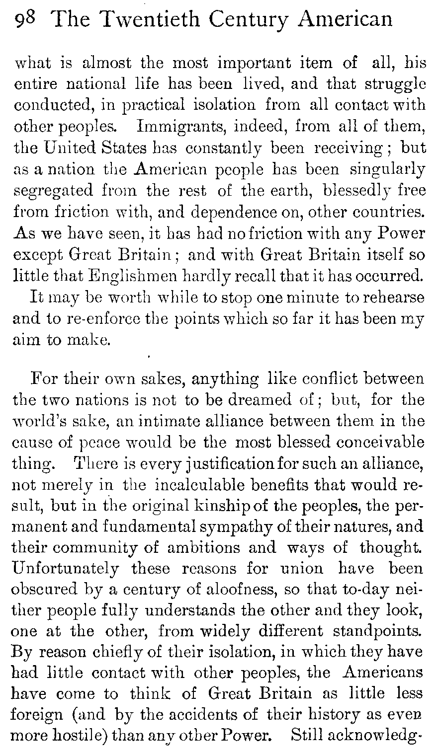 Not only does neither people understand with any clearness how like it is to the other, but each is under many misapprehensions—some trivial, some vital—in regard to the other's temperament and ways of life. These misapprehensions are the result chiefly of the geographical remoteness of the lands, so that intimate contact between anything like an appreciable portion of the two peoples has been impossible; and, when thus separated by so wide a sea, Great Britain [433]has been too consumedly engrossed in the affairs of the world to be able to give much time or thought to the United States, while America has been too isolated from that world, too absorbed in her own affairs, to be able to look at England in anything like true perspective.