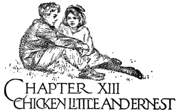 Huz and Buz, after lazily watching the children walk off, had apparently decided to join them, and were bringing up the rear a few yards behind. They were fat, rollicking pups, too young and clumsy to be very firm on their legs as yet. Jane turned round and ordered the rascals home. Marian called them back also, and after deliberating a moment uncertainly, they obeyed. They were encouraged to make a choice by a small stick Chicken Little hurled at them.