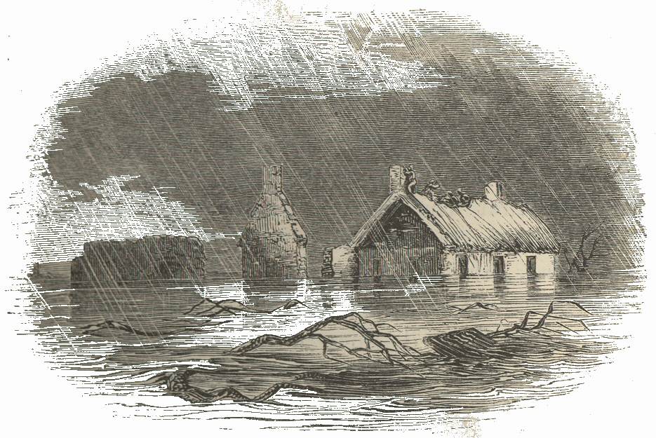 p. 51At daybreak the wide waste of waters was only bounded by the rising grounds on the south and west: whilst, towards the north and east, the watery world swept off, uninterruptedly, into the expanding Frith and the German Ocean. The embankments appeared to have everywhere given way; and the water that covered the fields, lately so beautiful with yellow wheat, green turnips, and other crops, rushed with so great impetuosity in certain directions, as to form numerous currents, setting furiously through the quieter parts of the inundation, and elevated several feet above it. As far as the eye could reach the brownish-yellow moving mass of water was covered with trees and wreck of every description, whirled along with a force that shivered many of them against unseen obstacles. There was a sublimity in the mighty power and deafening roar of waters, heightened by the livid hue of the clouds, the sheeting rain, the howling of the wind, the lowing of the cattle, and the screaming and wailing of the assembled people, that riveted the attention. In the distance could dimly be descried the far-off dwelling of poor Funns, its roof rising like a speck above the flood, that had evidently made a breach in one of its ends.