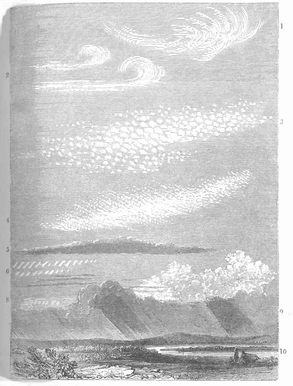 various forms of clouds—the cirrus, or curl-cloud—the cumulus, or stacken-cloud—the stratus, or fall-cloud—the cirro-cumulus, or sonder-cloud—the cirro-stratus, or wane-cloud—the cumulo-stratus, or twain-cloud—the nimbus, or rain-cloud—arrangement of rain-clouds—appearances of a distant shower—scud—cause of rain—formation of clouds—mists—heights of clouds—appearance of the sky above the clouds. |