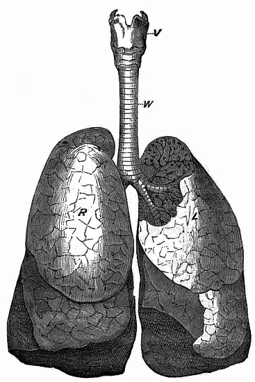 The Lungs are enclosed in the chest, which they fit exactly, and of which they occupy by far the largest portion, leaving but a small space for the heart. They consist of two halves (pl. II, R, L), each roughly resembling the upper part of a sugar-loaf somewhat flattened[12][11][10] and hollowed out at the bottom. The left shows two and the right three distinct flaps or lobes. They are only connected by means of the windpipe (pl. II, W) and its branches.