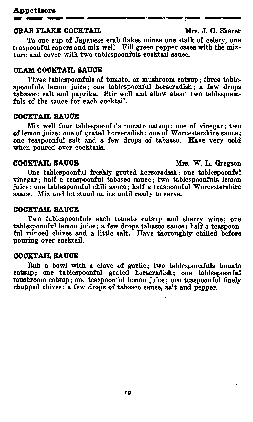 Two tablespoonfuls crabmeat to each person. To one cup tomato catsup add juice of one lemon, two tablespoonfuls grated horseradish thinned with vinegar; a few drops of tabasco sauce and just before serving, a tablespoonful cracked ice.[12]