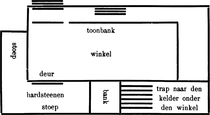 Van haar schoollokaal herinner ik mij zeer wel, dat het een rechthoekige ruimte was. De rijen banken, lange zitbanken, enkele met schrijftafels, stonden evenwijdig met de lange rechthoekszijden. Aan den voorwand hingen de negen leestafels van Prinsen. Er was maar één raam, dat in een der korte zijden, precies in den hoek, uitzicht gaf op muren en daken. In den hoek der andere korte zijde was de deur, ongeveer aldus: