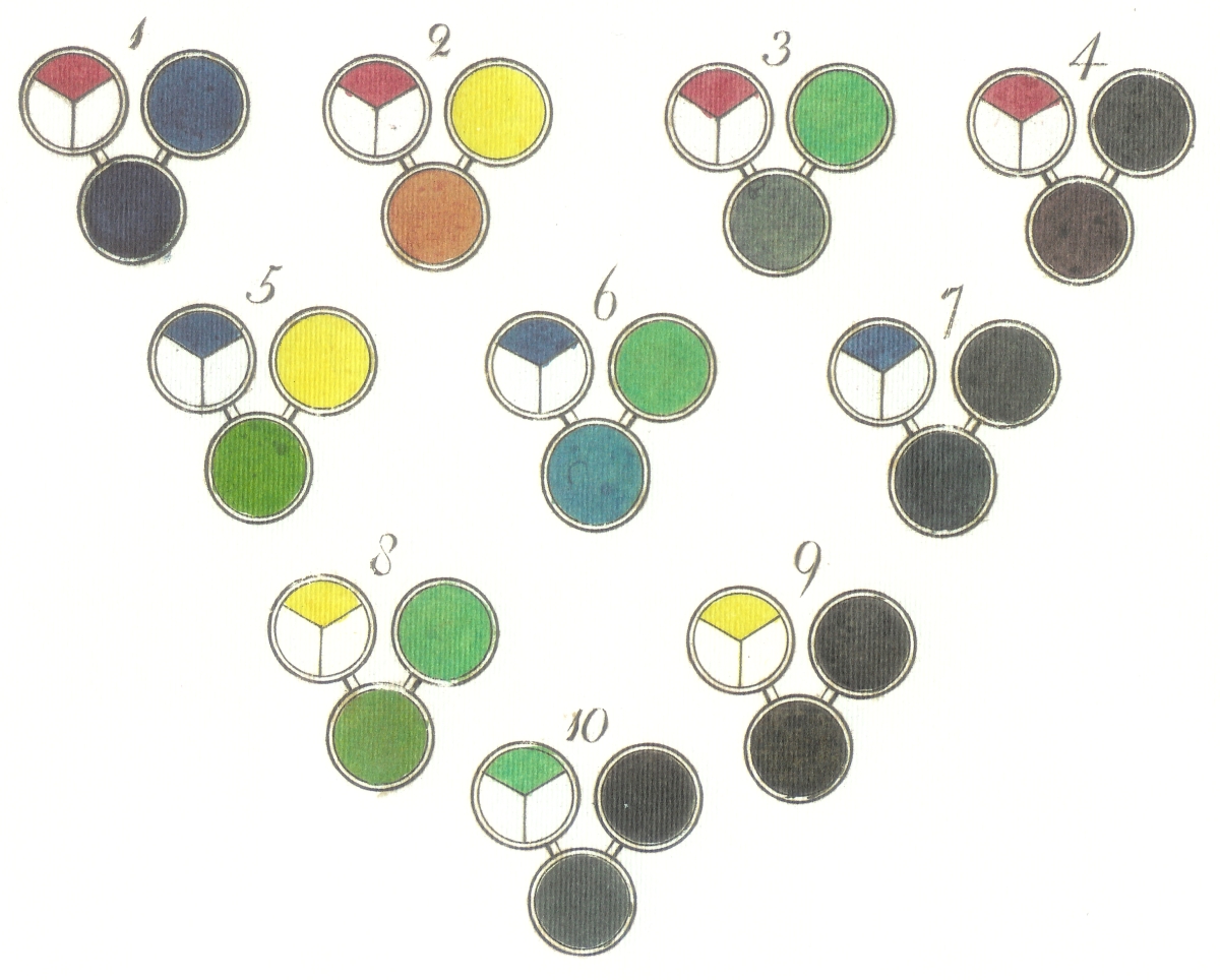 § 11. Combinando as Cores elementares[8] preparadas pela Natureza, ou pela Arte, achei todas as graduaçoens das Cores compostas, relativas a cadahuma dellas; e as classifiquei na ordem mais natural, e intelligivel. A exposiçaõ deste processo formará a Parte Synthetica; a qual por mayor clareza devidi em duas Secçoens. A primeira expora o modo, com que a Natureza, por meyo de huma combinaçaõ admiravel das duas Cores primitivas, formou todas as que vemos nos corpos naturaes. A segunda indicará o methodo com que, só com as duas Cores primitivas, e quatro outras que se derivaõ immediatamente dellas, se podem imitar todas as Cores naturaes.