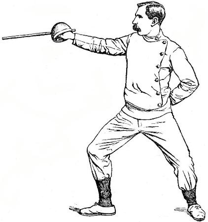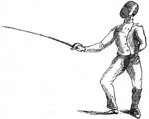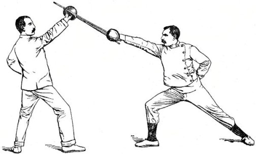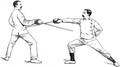 The left arm, supplying the place of the targe, alluded to in Scott’s lines, is doubtless an advantage; but, in the case of the two combatants whose merits we are considering, the ordinary swordsman possesses superior reach, can lunge out further, and knows full well the value of the point.